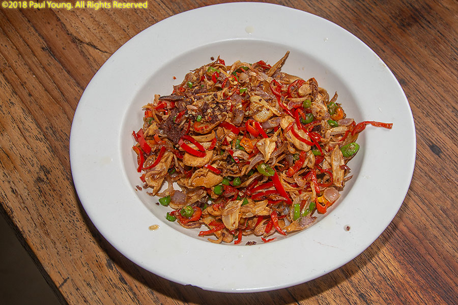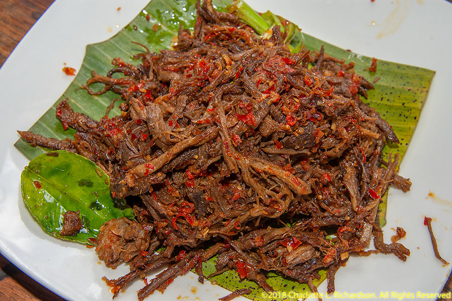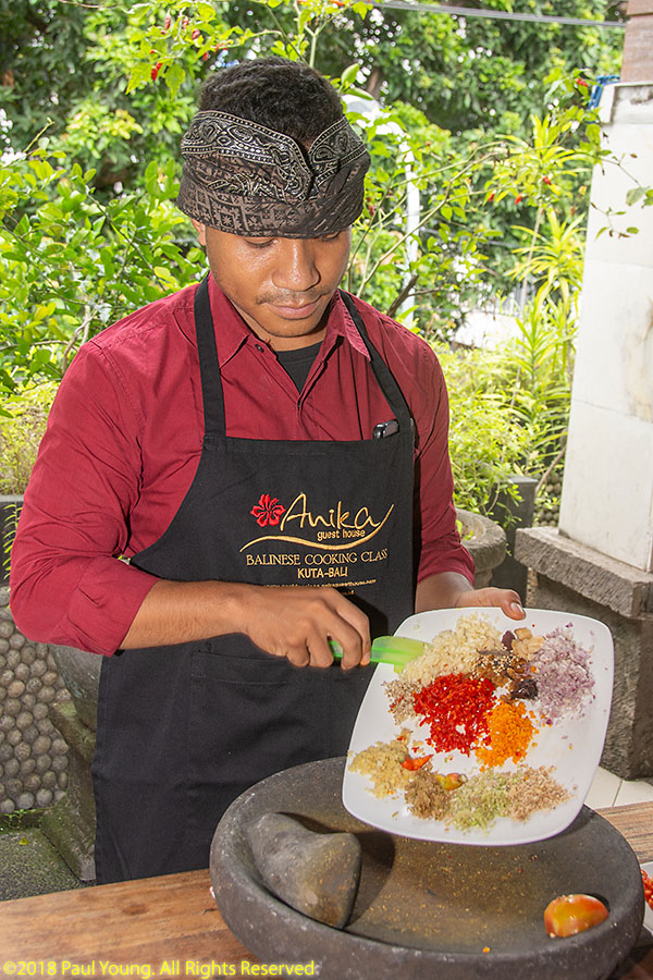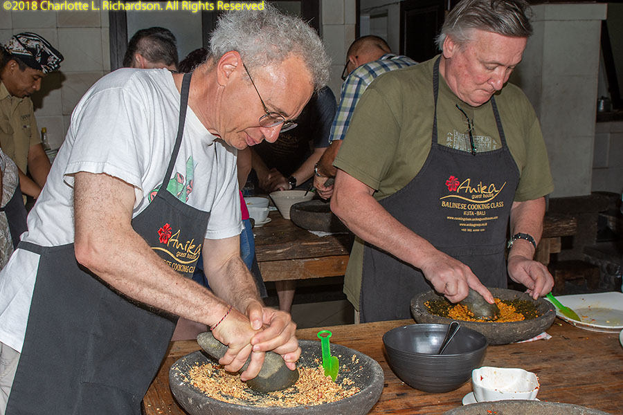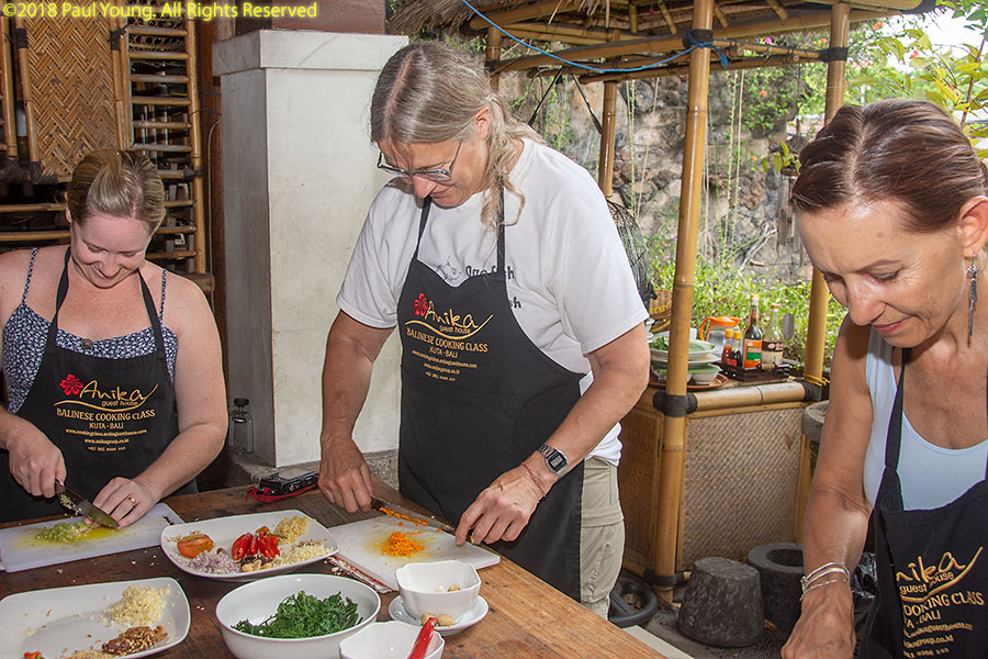 The hands-on, six-hour, Anika Bali Cooking class taught us about the fresh herbs, spices, and other ingredients that make up Balinese food. We visited the market, then prepared and feasted on a complete Balinese menu: fish curry, shredded spiced beef, chicken satay, fern lawar, sweet corn patties, fragrant yellow rice, fried rice (nasi goreng), fruit in coconut milk, and fried bananas.