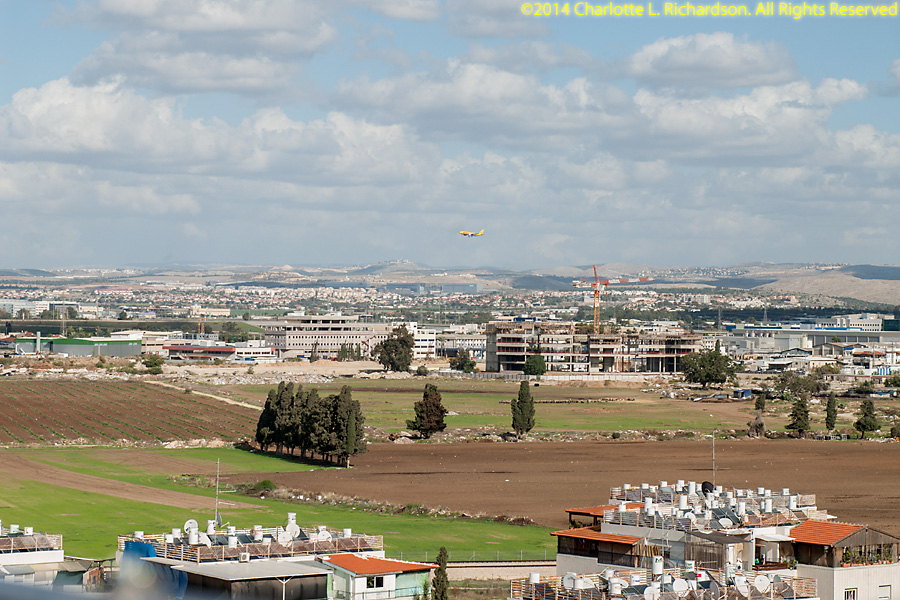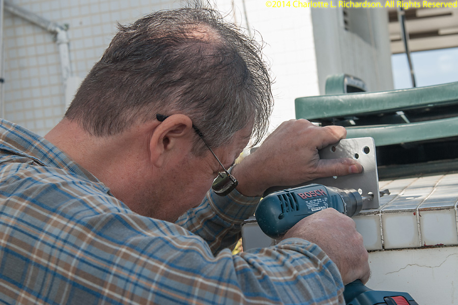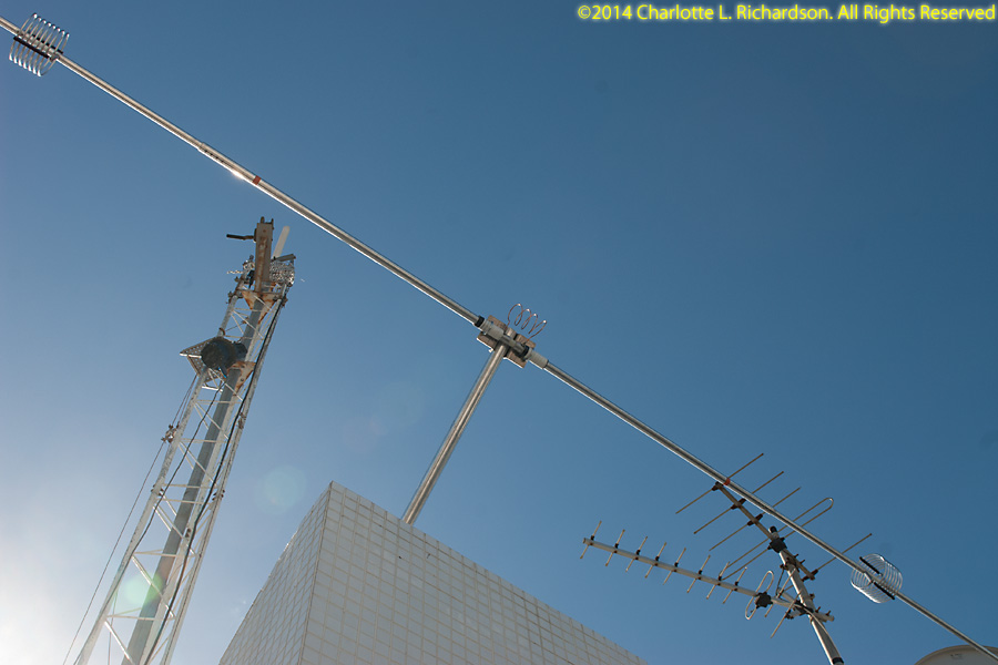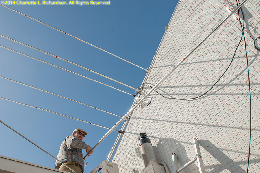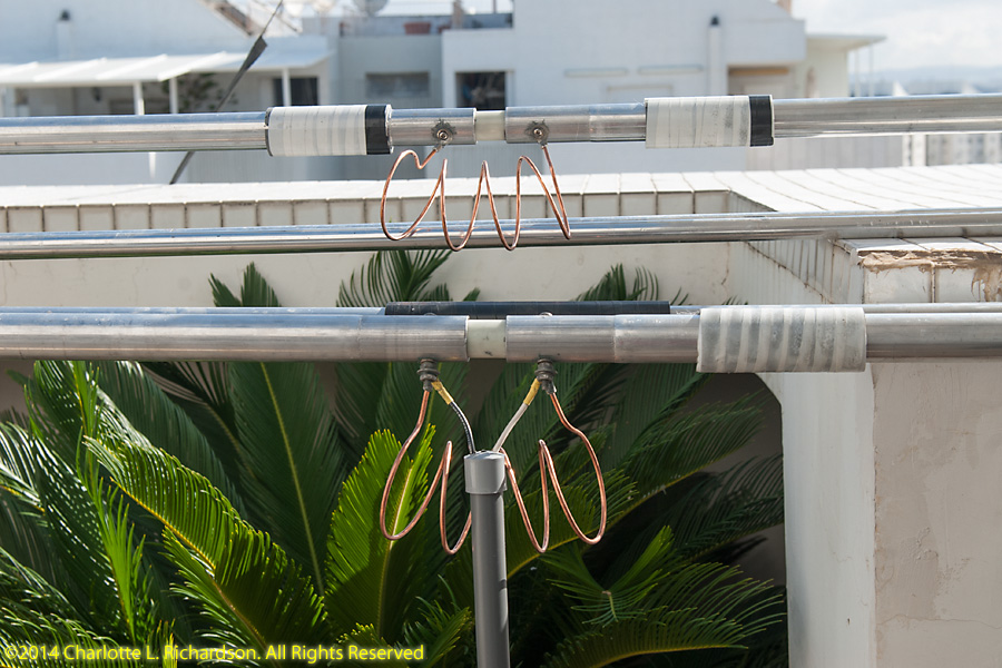 Assembling and installing the new Force12 antenna. Ilya assembled the elements on the rooftop patio, and then attached elements on one end of the boom by attaching the boom to the solar panel roof. Then he and Paul attached elements to the other end, extending the boom up the slope away from the tower, until all elements were in place. Then the antenna was raised up the tower. This job was tougher than it should have been because of missing antenna parts. English-sized bolts are not easy to find in Israel, which uses metric bolts. Ilya has a small stash of English-sized hardware. The replacement bolts shipped from the US came without any nuts or washers, which are, not surprisingly, not any easier to find in Lod than the bolts themselves are. The boom-to-mast clamp was sized for US water pipe and would not quite accept bigger bolts to fit over the bigger Israeli mast, but Ilya was able to drill out the holes a little.