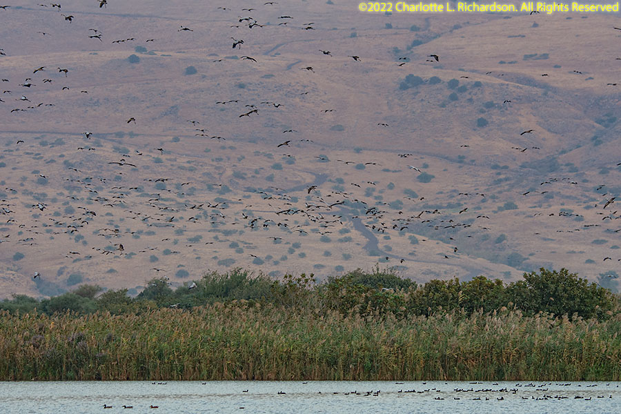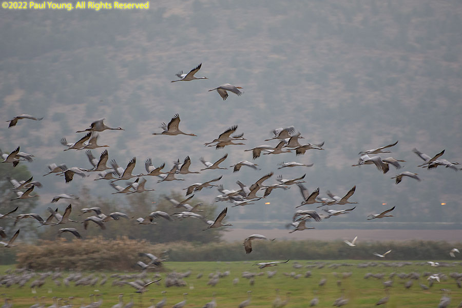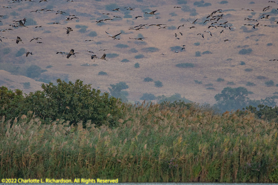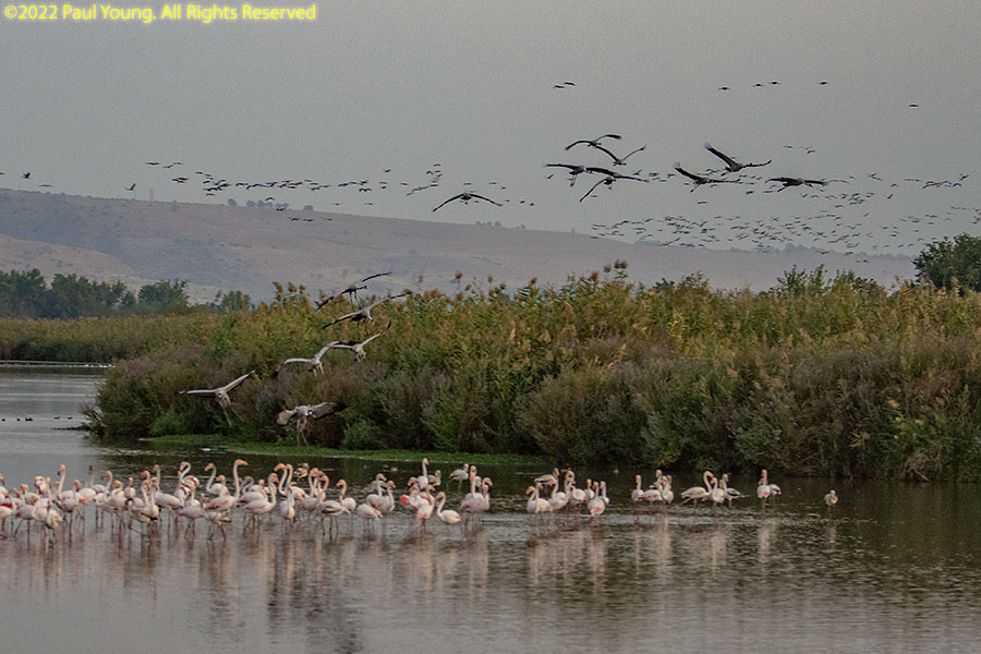Hula Lake Park, north of the Sea of Galilee, lies in the center of the Hula Valley in the Upper Galilee bordered by mountain ranges, the Golan to the east and the Naphtali Range to the west. More than 500 million birds, waterfowl, birds of prey, and songbirds of 390 species including twenty globally-endangered species, migrate through this area of the Hula Valley in the spring and fall.