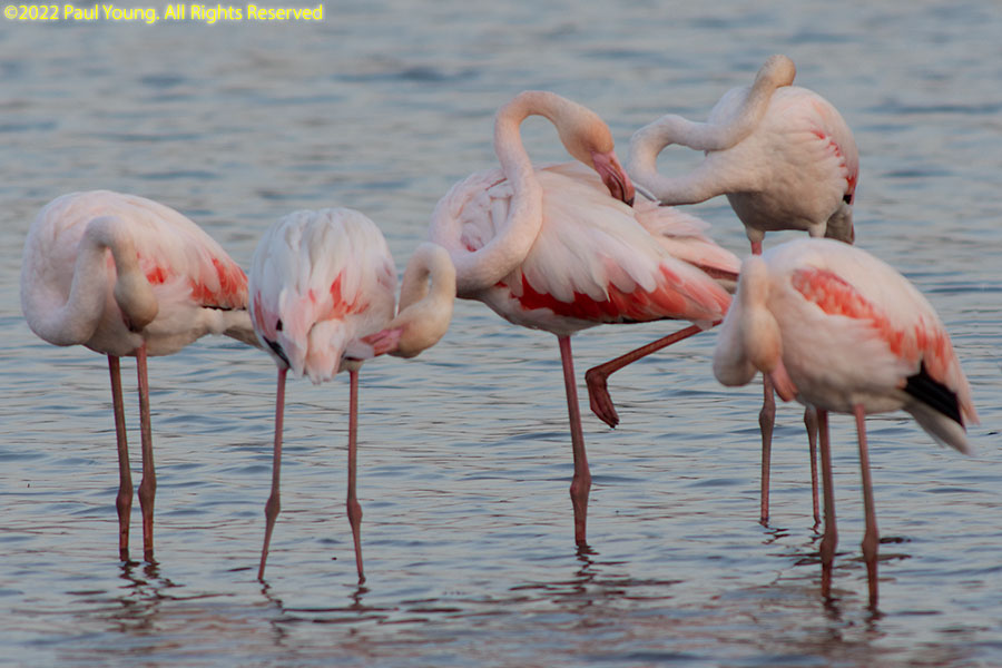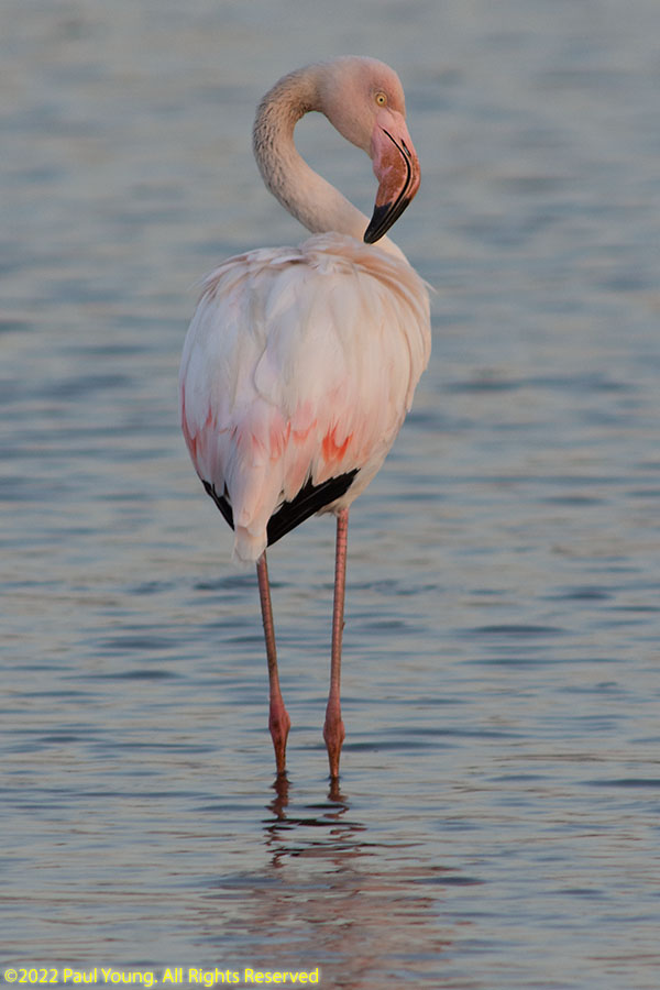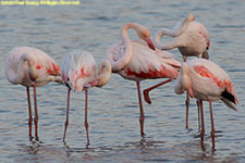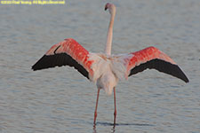 Greater flamingo, Phoenicopterus roseus, adult left, juvenile right