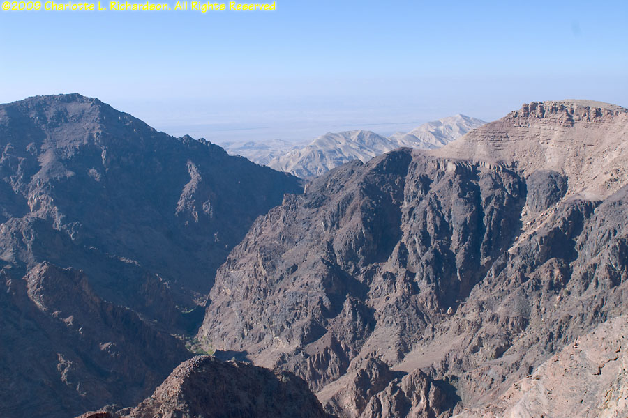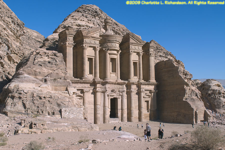 Up into the mountains to Al-Deir (the Monastery), built in the 3rd century B.C.E. as a Nabataean tomb, with view of Aaron's Tomb on Mount Hor (Jebel Haroun) and Wadi Araba: