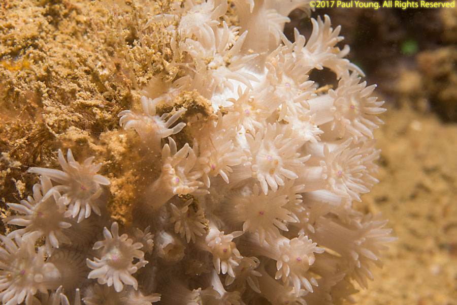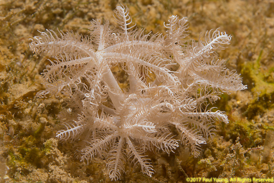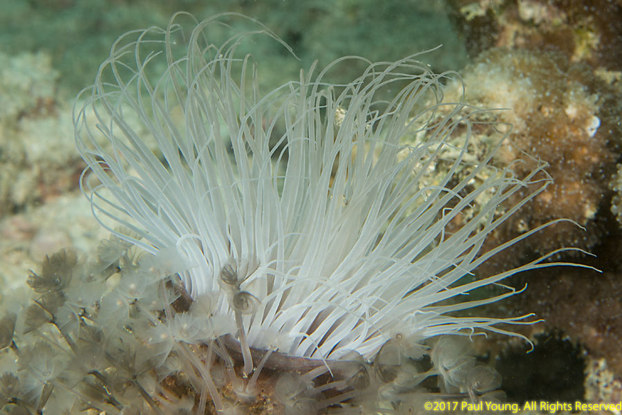 Tube anemones (tube-dwelling anemones, ceriantharians) look like sea anemones but are not closely related. They are solitary and live buried in soft sediments. The tube, into which the animal can withdraw, is made of mucus and threads of phychocysts. The crown of tentacles has two whorls. The large outer tentacles are used to capture food, and the inner ones to manipulate and ingest it.