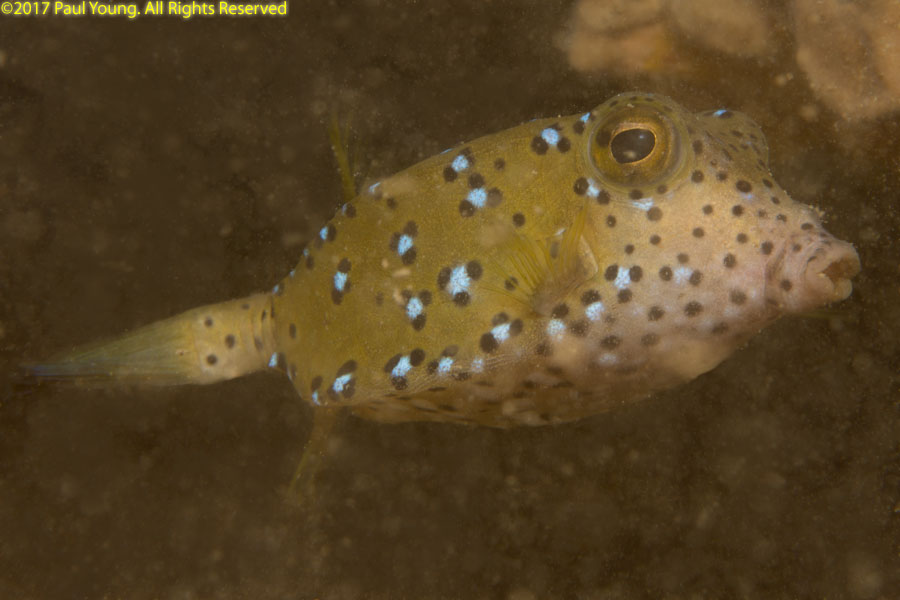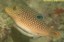 Pufferfish have spines which are only visible when the fish has puffed up. They eat crustaceans, algae, and mollusks. Most species are highly toxic.