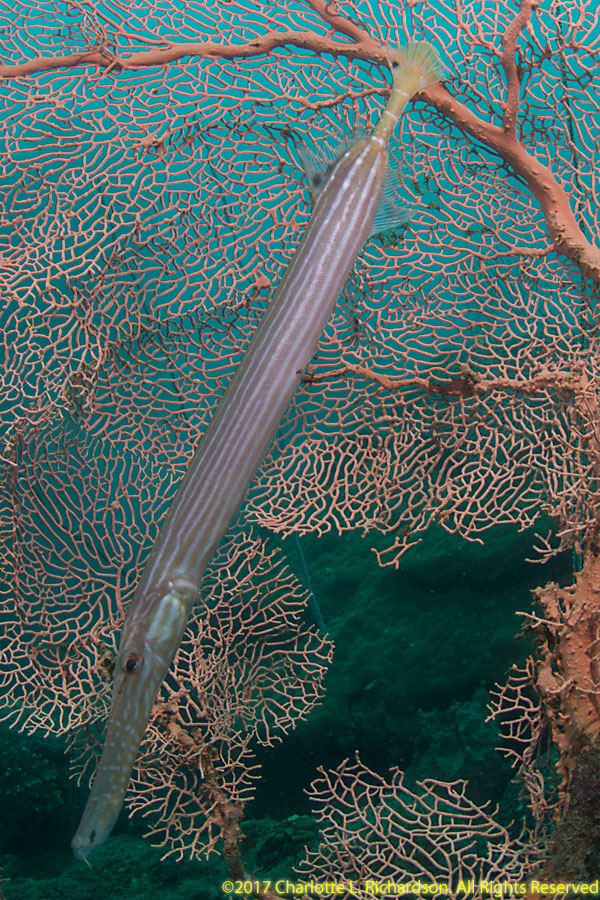 The Chinese trumpetfish, Aulostomus chinensis, hangs vertically among branches of coral to ambush prey. They can be many different colors.