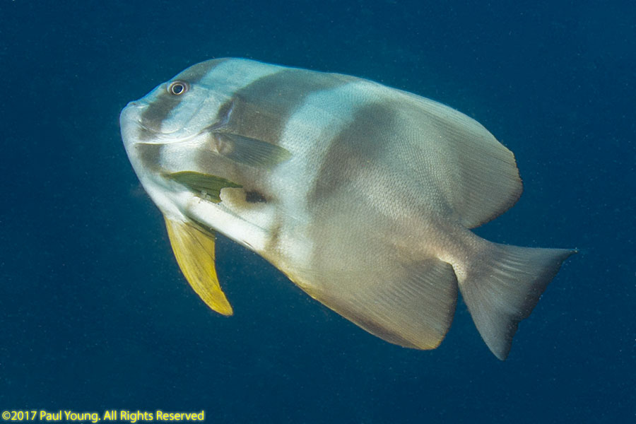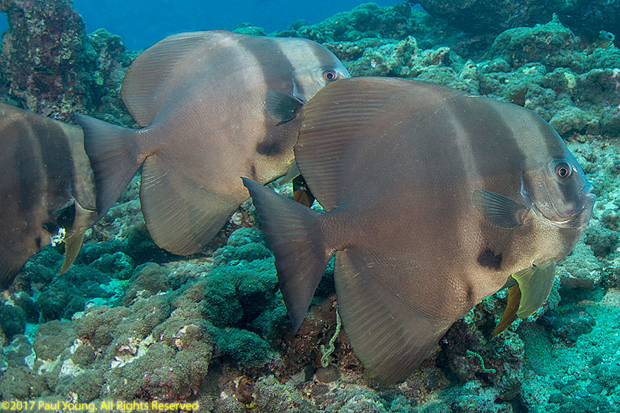 Batfish (Platax) are Indo-Pacifc reef-associated fish of the family Ephippidae. There are five extant species, three of which occur in the Maldives. Adults are disc-shaped with laterally-compressed bodies and large dorsal and anal fins, giving them a triangular profile.