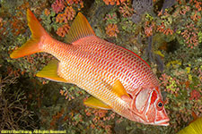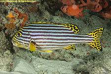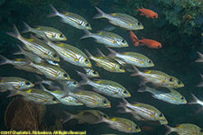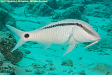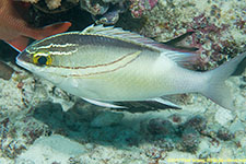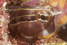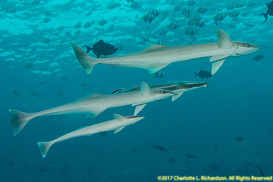 There are four families and eight species of remoras found in tropical and subtropical waters. Four are found in the Maldives. These two are the most common. The grey ones are short suckerfish (live sharksucker), Remora remora. The striped one is slender sharksucker, Echenis naucrates. Remoras have a sucker disk on top of the head which evolved from a spinous fin into a series of laminae.