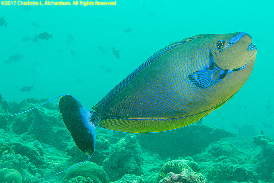 Unicornfish are in the surgeonfish family. Some species have a "rostral protuberance", a horn-like extension of the forehead. They eat algae.