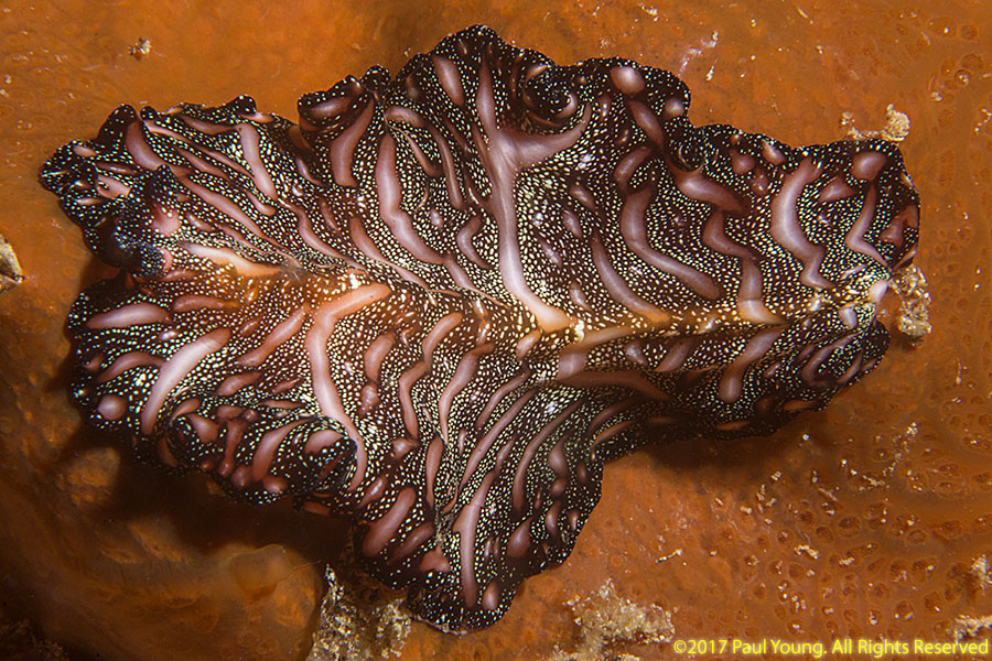 Gold-speckled flatworm (yellow pupillae flatworm, marine flatworm, yellow-spotted flatworm, yellow-spotted polyclad worm), Thysanozoon nigropapillosum