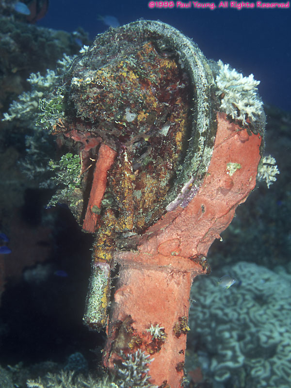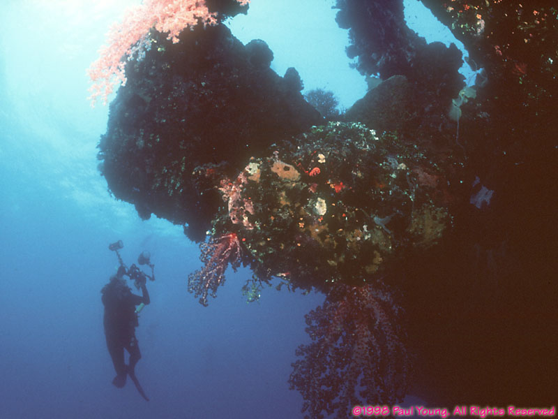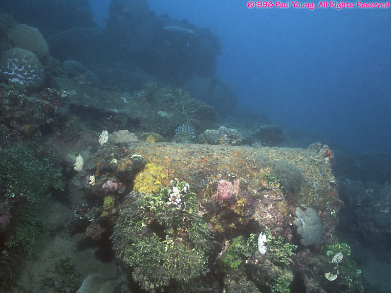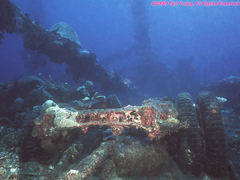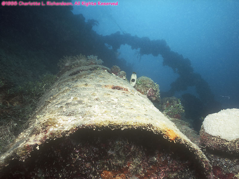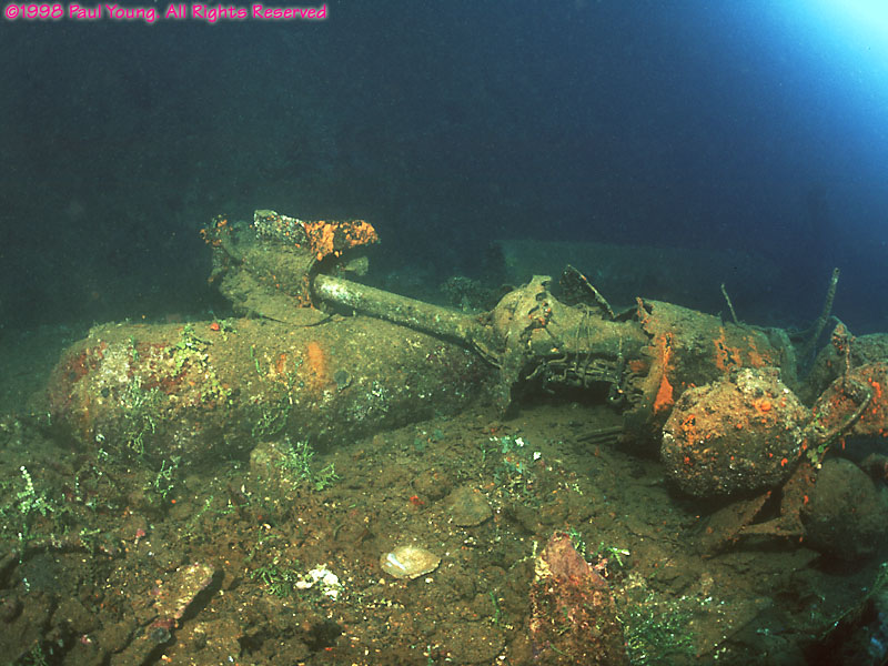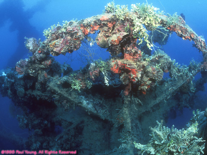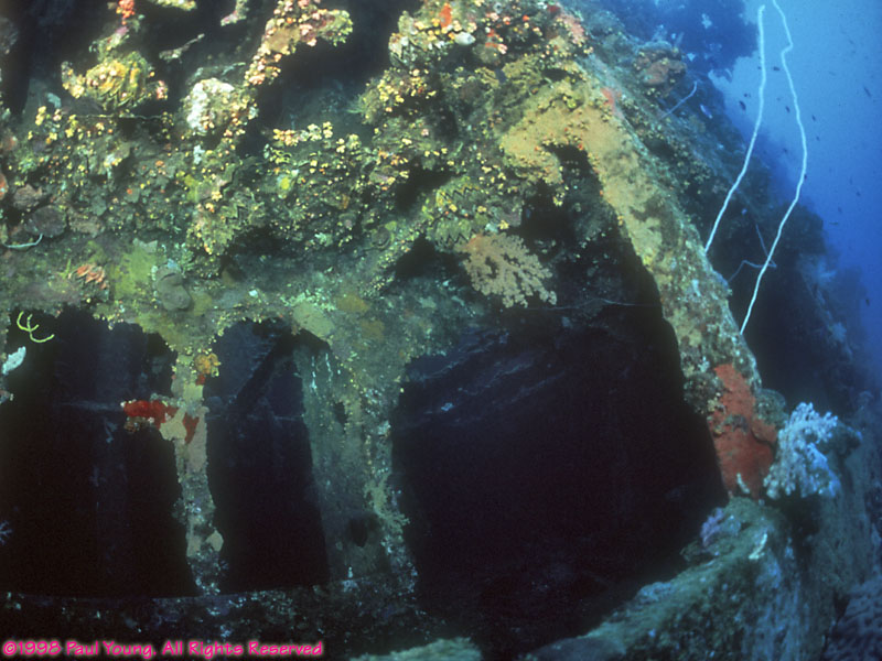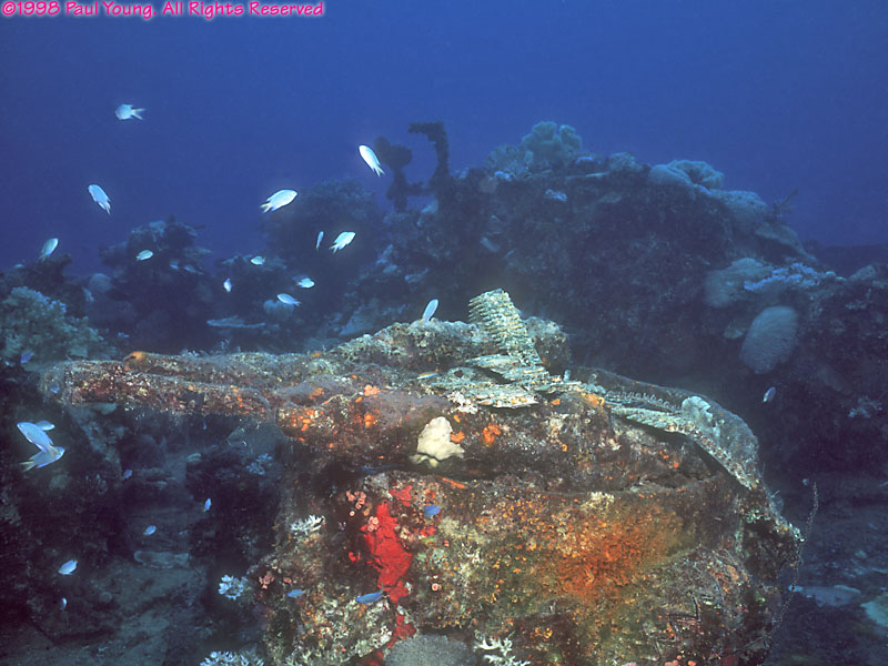 Fujikawa Maru: The most spectacular wreck we dived, the Fujikawa Maru is a 436' armed aircraft ferry with large deck guns and lots of cargo, resting upright with the deck at 50' and the stubs of two masts exposed, near Eten Island.