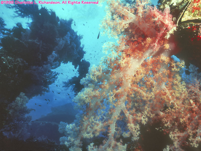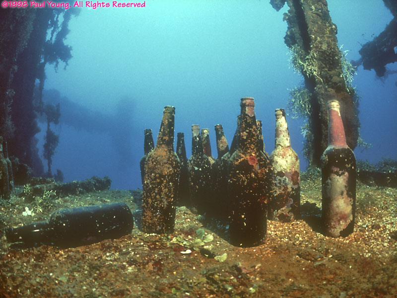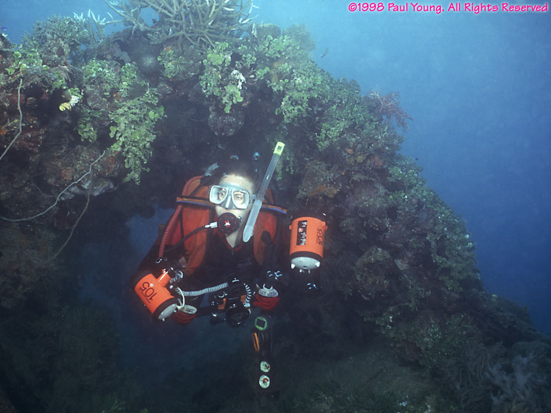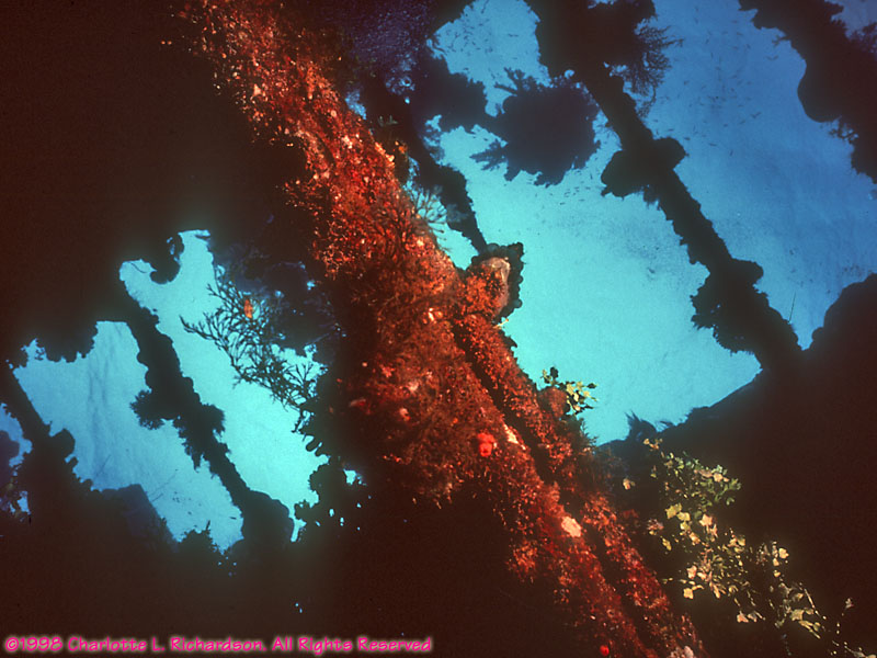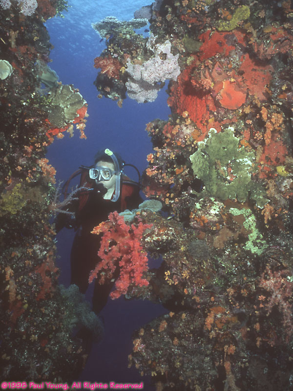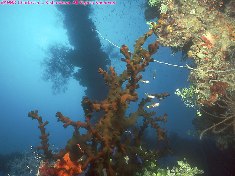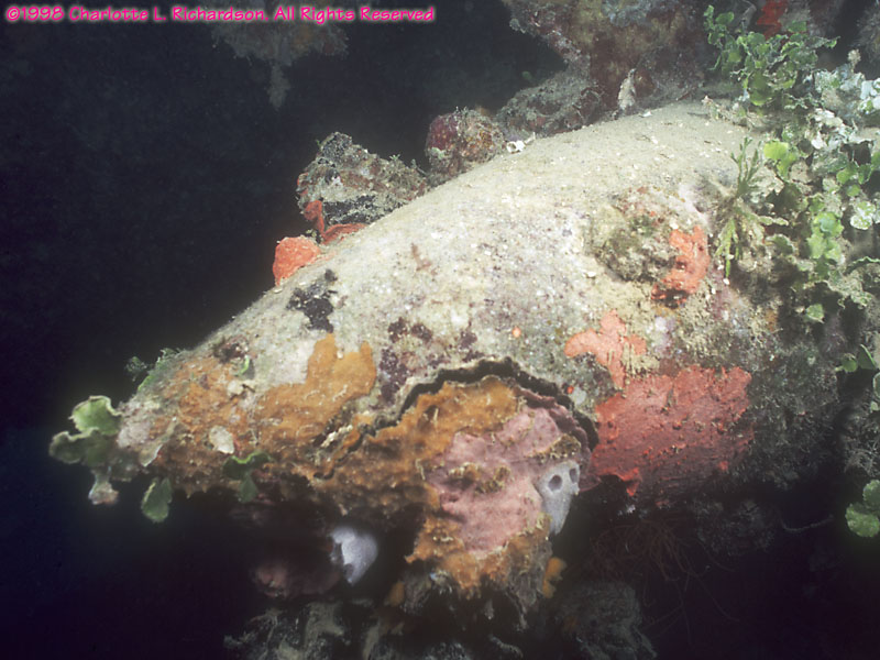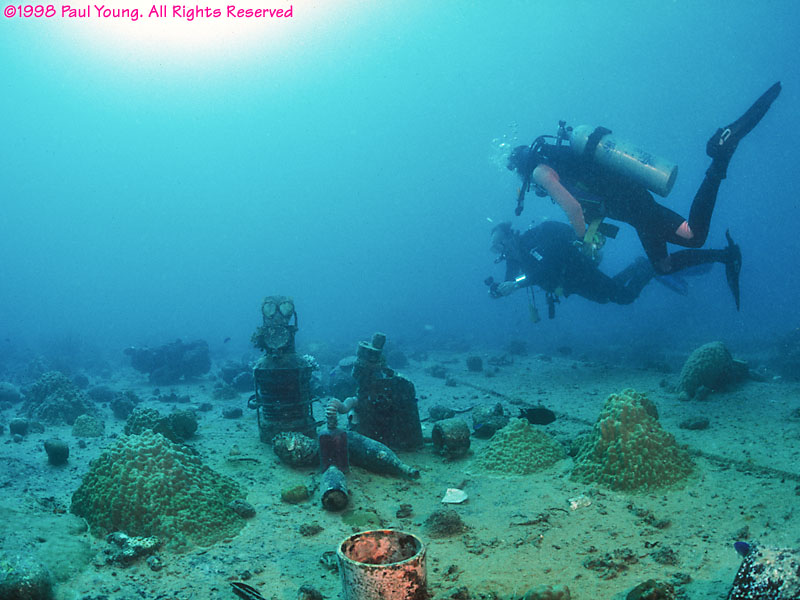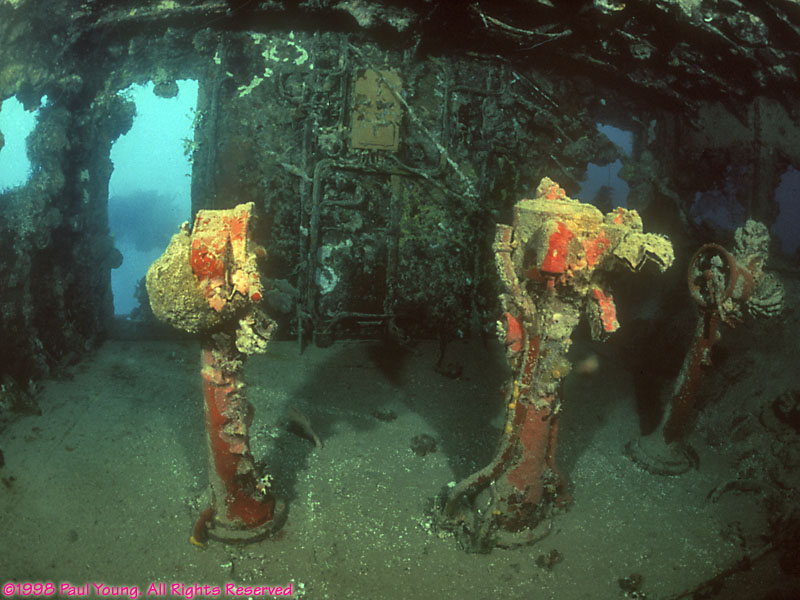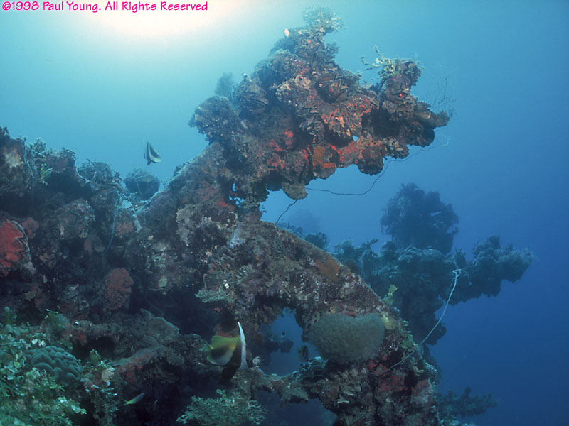 Fujikawa Maru: The most spectacular wreck we dived, the Fujikawa Maru is a 436' armed aircraft ferry with large deck guns and lots of cargo, resting upright with the deck at 50' and the stubs of two masts exposed, near Eten Island.