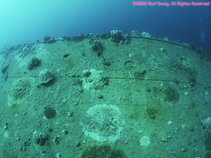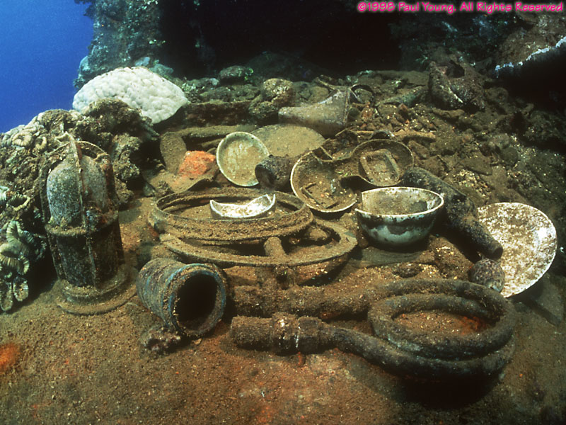 Heian Maru: Largest ship in the lagoon, a passenger ship converted to a sub tender, lying on its port side at 110' off Dublon Island.