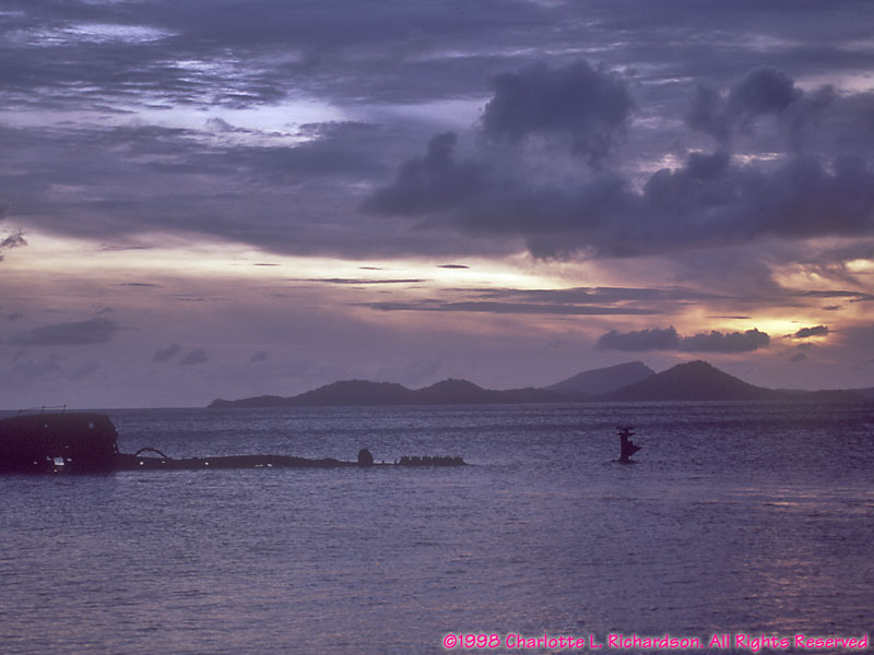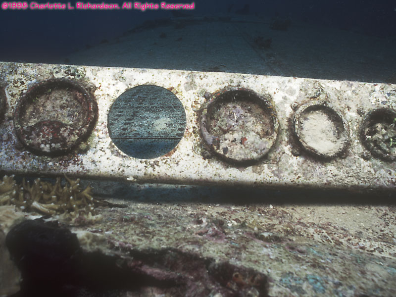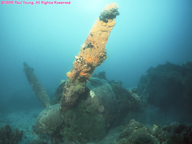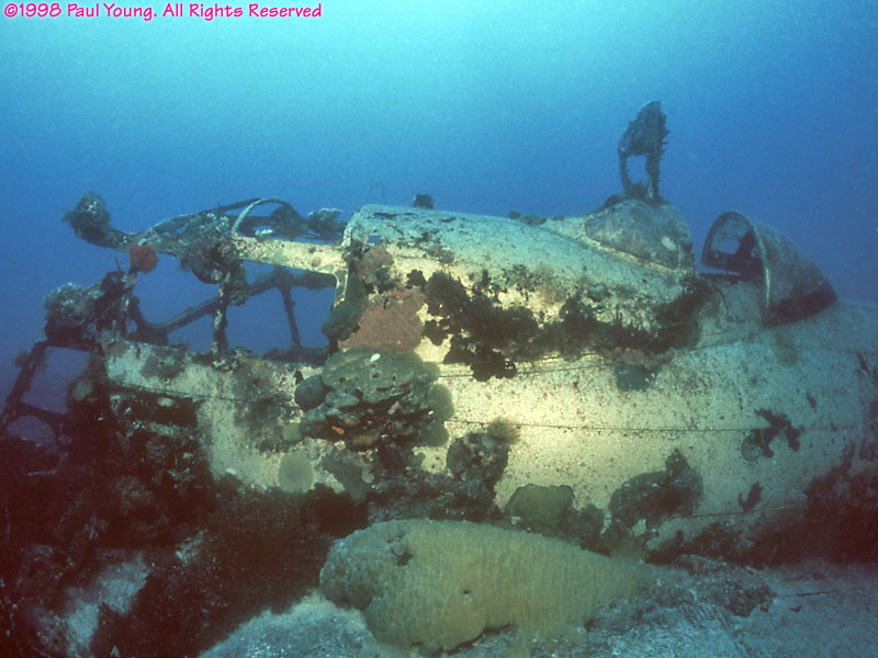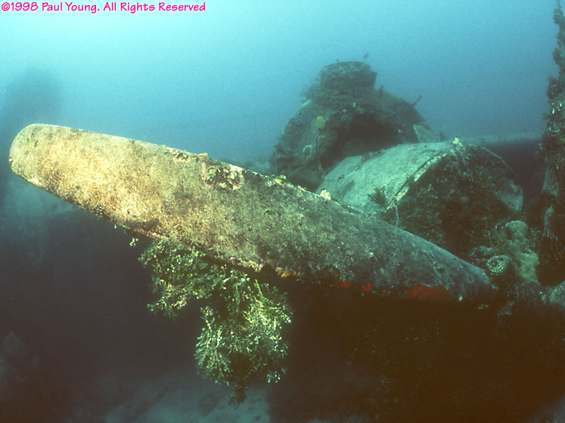 Emily Flying Boat: very large airplane lying upside-down at 50' off Dublon Island.