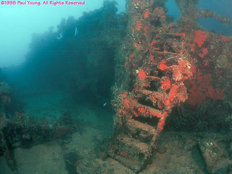 Sankisan Maru: a 370' cargo vessel lying upright in 50-100' with one mast exposed, near Uman Island.