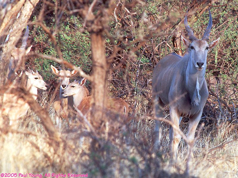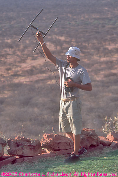 The acclimated leopards are radio-collared, which makes them only slightly easier to locate. The collared female at the far right and her cub had taken an eland calf, large prey for a leopard. At least she has learned to hunt for herself rather than depending on handouts.