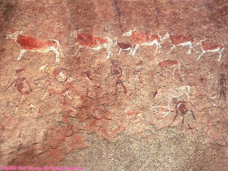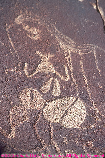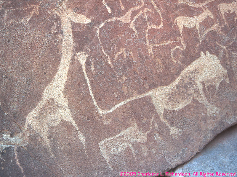The second panel shows the famous "white lady of the Brandberg", though the image is almost certainly that of a man. Charlotte found the giraffe paintings more interesting, since giraffes are no longer found in this area. There are thousands of bushman paintings in the Brandberg mountains.