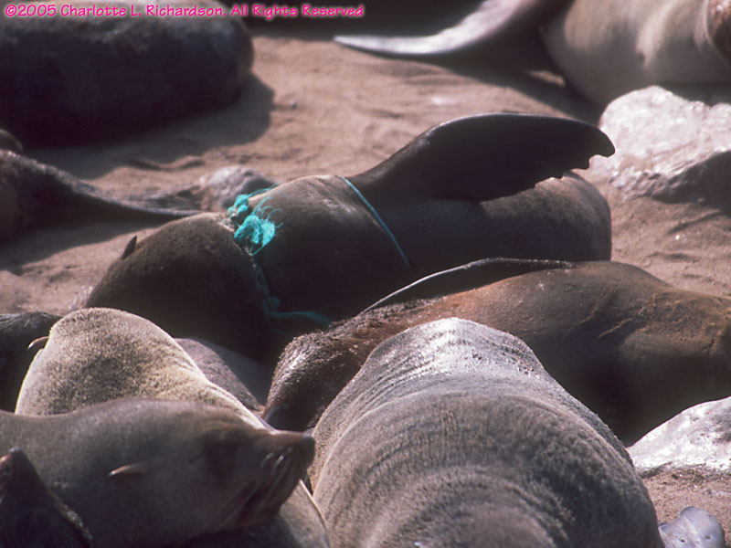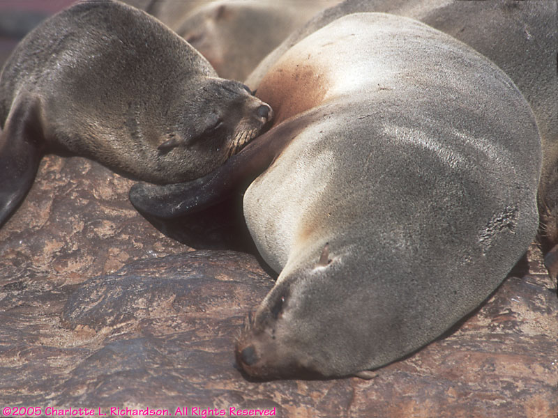 When we visited, the seal colony contained mostly females and a few bulls. These are eared seals, like sea lions, and they smell like sea lions. One fur seal was caught in a nylon fishing net. It seemed weird to see black-backed jackals (Canis mesomelas) checking out the pinnipeds, looking for dead pups, afterbirths, and any other edible debris. Someone was studying the jackals, so some of them wore radio-tracking collars.