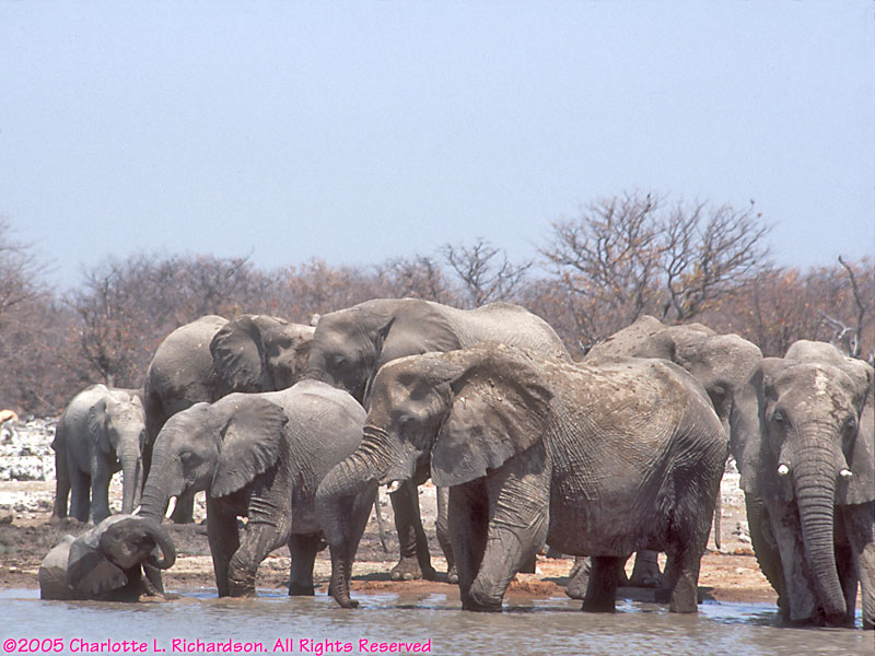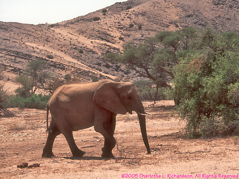 These desert-adapted elephants range up and down the mostly-dry river bed checking out waterholes. Even if there has been no water in a particular location for many years, the adults lead the calves there so that the young animals learn the routes to where water may be available.