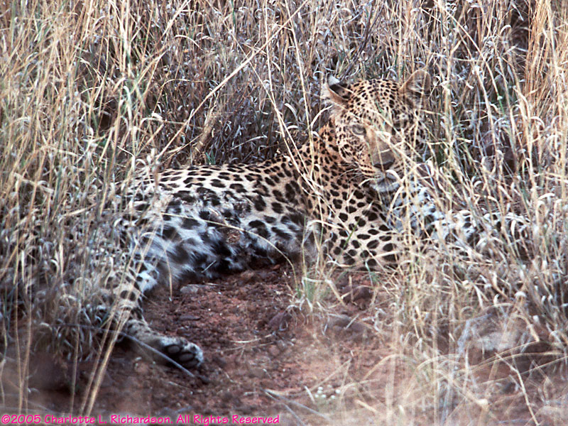 Leopards (Panthera pardus) are fairly common in Namibia, both on ranches and in the eastern part of Etosha National Park, but are hard to spot. This female and cub are at Okonjima (Africat Foundation). We were able to locate them only because the female wears a radio collar.