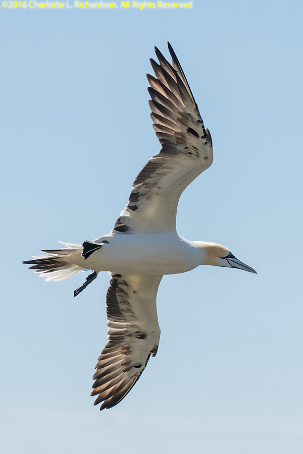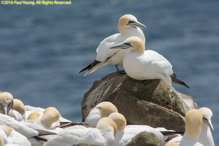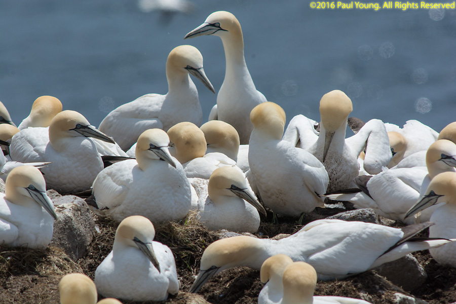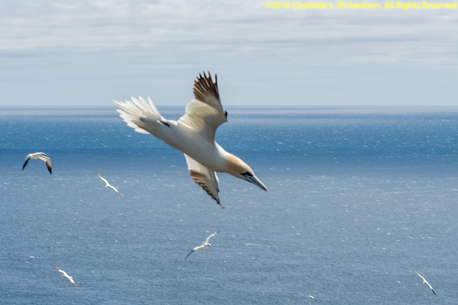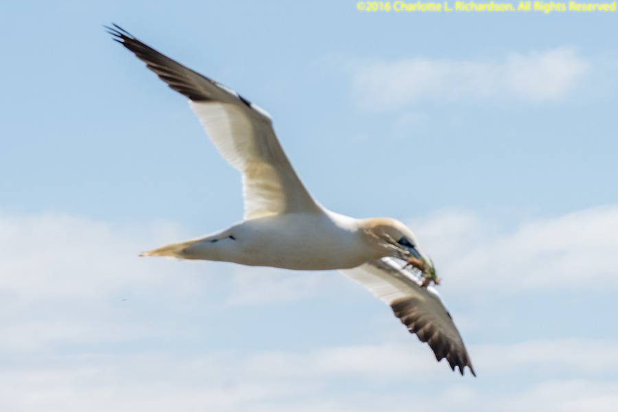 The Northern gannet, Morus (Sula) bassanus, is the largest gannet. The other two Newfoundland colonies are on Funk and Baccalieu Islands. Northern gannets are related to boobies and nest on both sides of the North Atlantic in large colonies on cliffs overlooking the ocean. Fledgling birds are brown with white wingtips. They reach the mature color pattern at about age five. Gannets dive vertically into the sea at velocities up to 60 mph. Nests are built of seaweed and other floating ocean debris such as fishing nets.