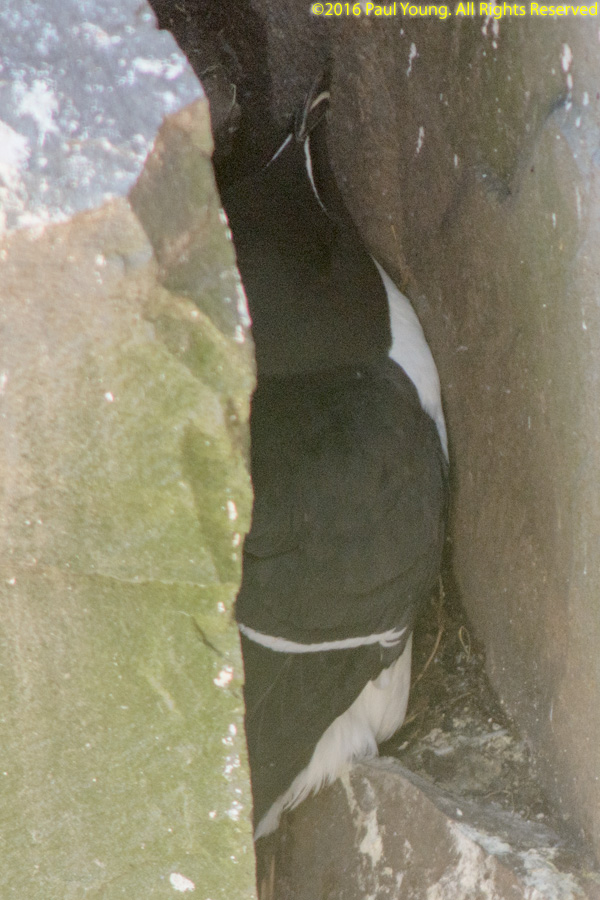 The Razorbill, Alca torda, is a colonial cliff-nesting North Atlantic auk that only comes to land to breed. Razorbills nest in enclosed crevices.