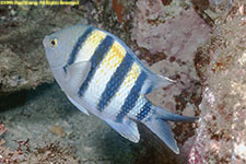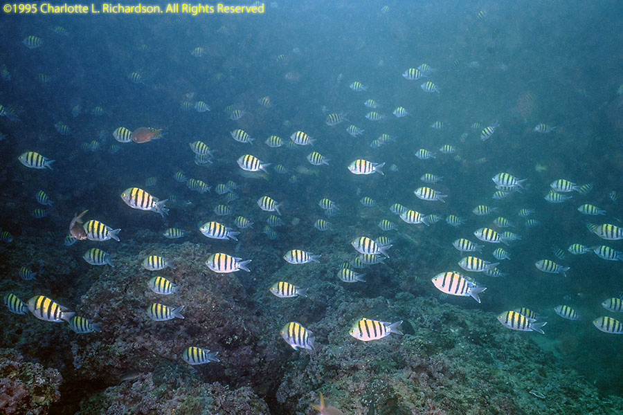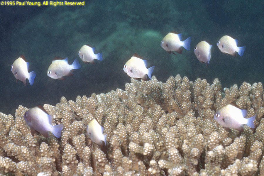 Indo-Pacific sergeants, Abudefduf vaigiensis, and unknown cardinalfish (foreground)