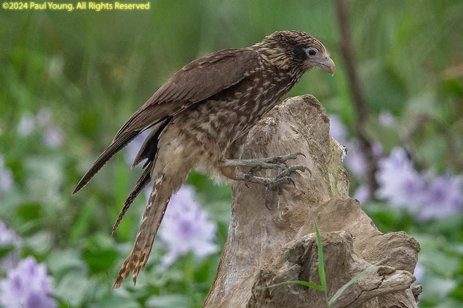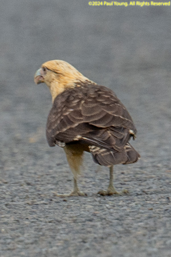 Caracaras are New World falcons. They often feed among cattle, eating the larvae of social insects, or on roadkill carrion.