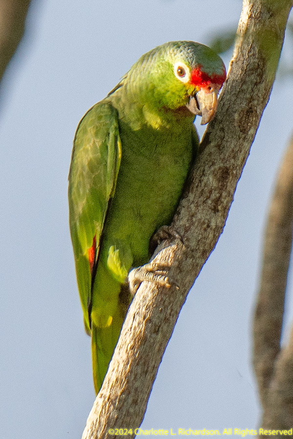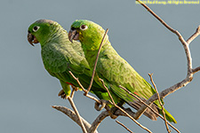 Parrots: Nearly half of the world's 332 parrot species live exclusively in the Neotropics. 22 species occur in Panama. Many are predominantly green with patches of red, yellow, or blue. They usually nest in tree hollows. Parrots use their strong stout bills to feed on fruits and nuts, often holding and manipulating food with their feet.