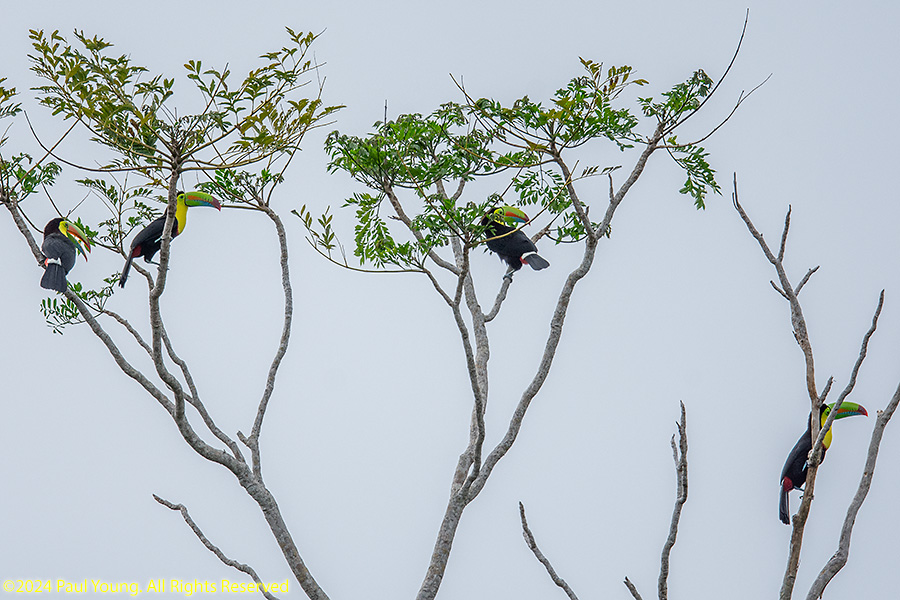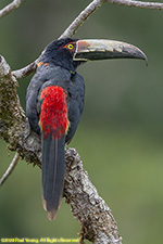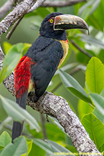 Toucans and aricaris often perch in the open. There are seven Central American species. They are the dominant avian frugivore in Neotropical forests. Their flight is an undulating flap-and-glide. Toucans are related to barbets.