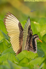 Jacanas and gallinules: The two species of jacanas both have long necks, long yellow bills, frontal shields, and very long toes. Gallinules (moorhens or marsh hens) are medium-sized water birds related to rails and coots. They have short rounded wings and are weak fliers, but have strong legs and long toes.
