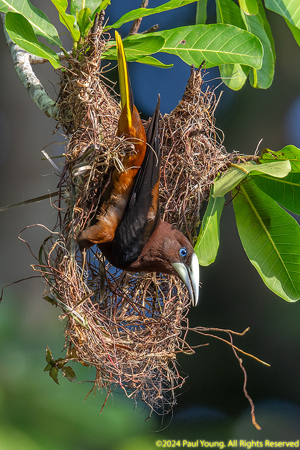 Oropendolas are vocal New World blackbirds found in Central and South America. They are large birds with pointed bills and long tails which are at least partially yellow. They are colonial breeders, building woven basket nests hanging from the tips of branches.