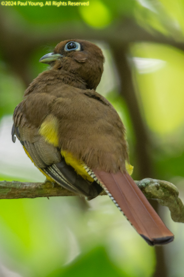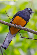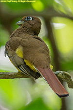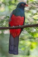 Trogons are related to quetzals. They gnaw holes in trees or termite nests to make their nests, and have broad bills and weak legs.