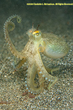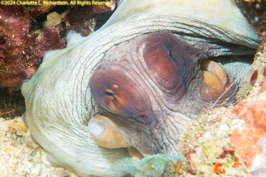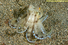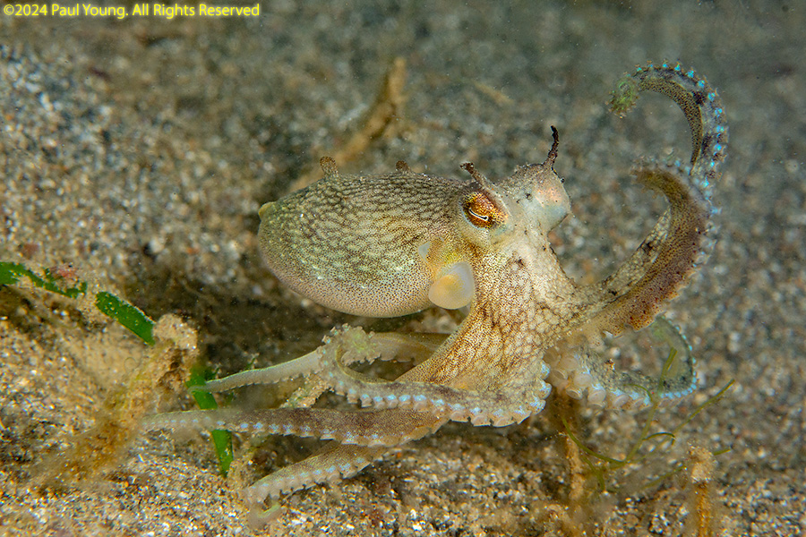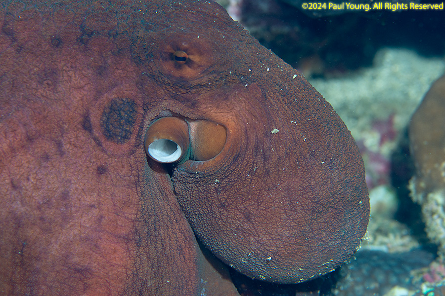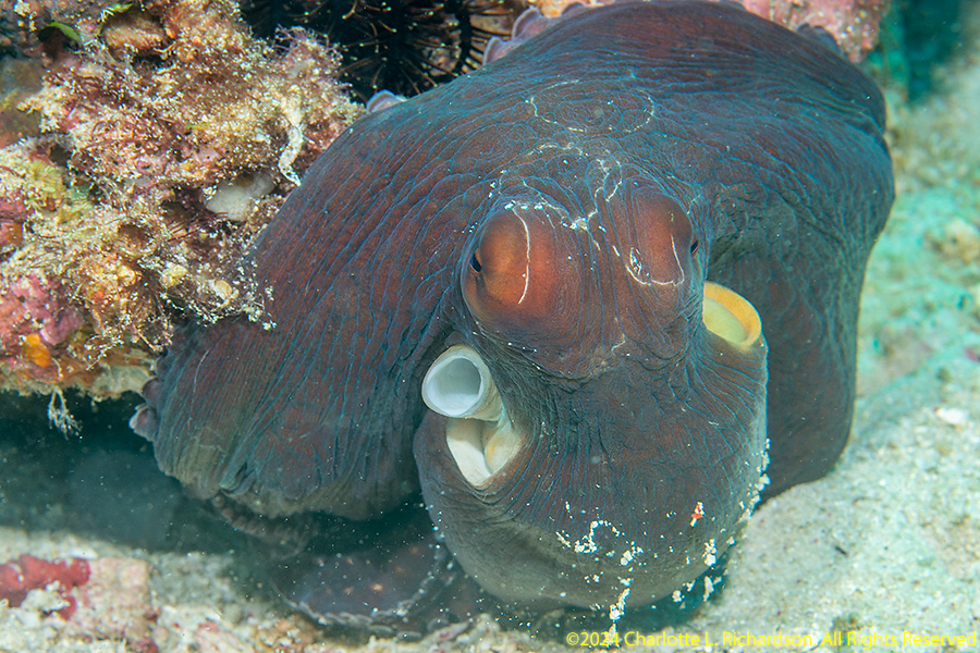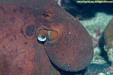 An octopus is a soft-bodied eight-limbed mollusc with two eyes and a beaked mouth at the central point of the eight limbs. They have complex nervous systems and excellent eyesight. The day or blue octopus is the common large day-active octopus in the Indo-Pacific.