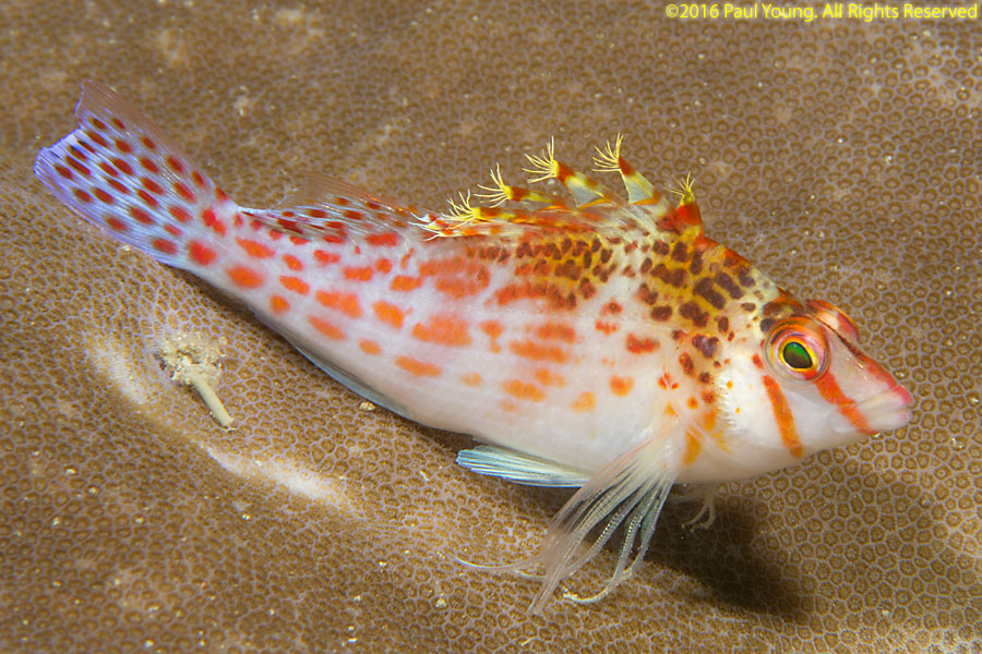 Hawfish have large heads and merged dorsal fins, the first consisting of ten connected spines. At the tip of each spine are several trailing filaments.