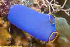 Tunicates (ascidians) or sea squirts have a tough outer "tunic" made of polysaccheride cellulose. In some colonial species the tunics of adjacent animals are fused. They feed by taking in water through the oral syphon. After flushing through the mucus-covered gill slits the water exits through the atrial syphon.