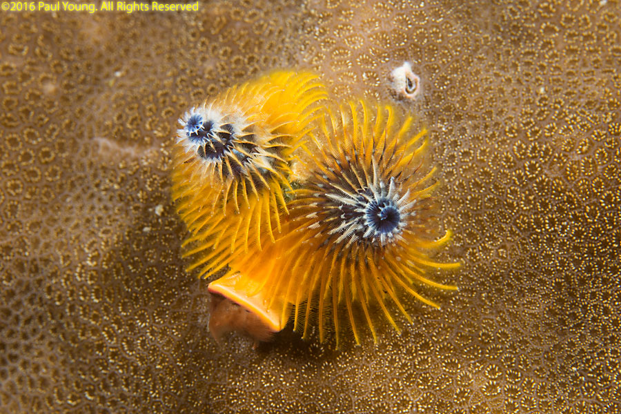 Christmas-tree worms are tube-building polychaete worms. Each animal has two feeding and respiratory spirals. They do not move outside their tubes. They have an operculum to close the hole when they are withdrawn into the tube.
