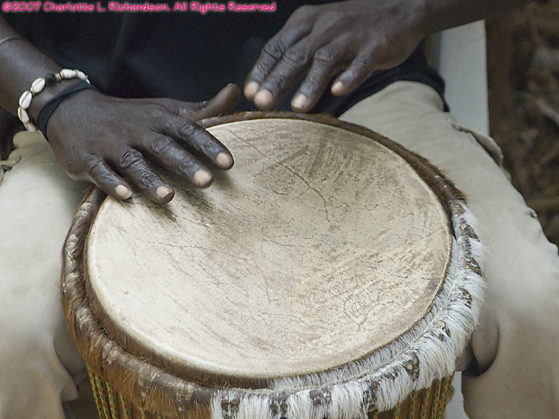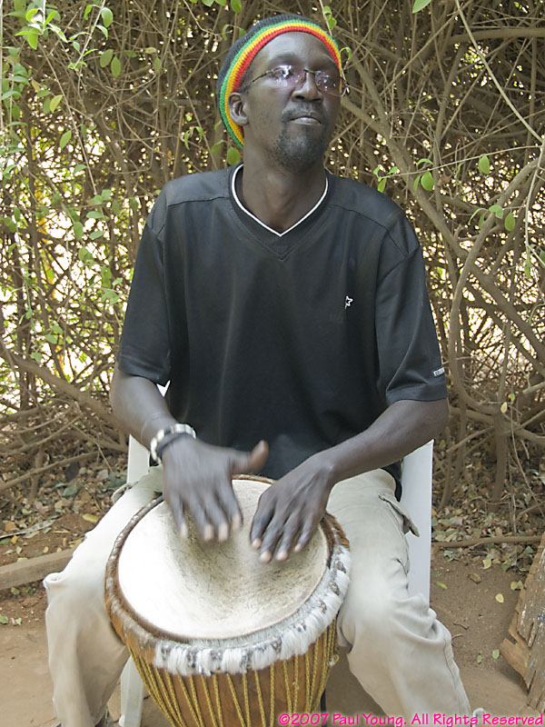Traditional musicians, one playing a 21-string kora, a cross between a harp and a lute. The belly of the Kora is a large gourd (calabash) and the head is cowhide.