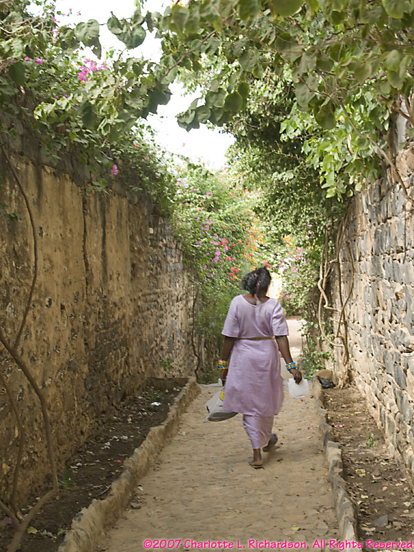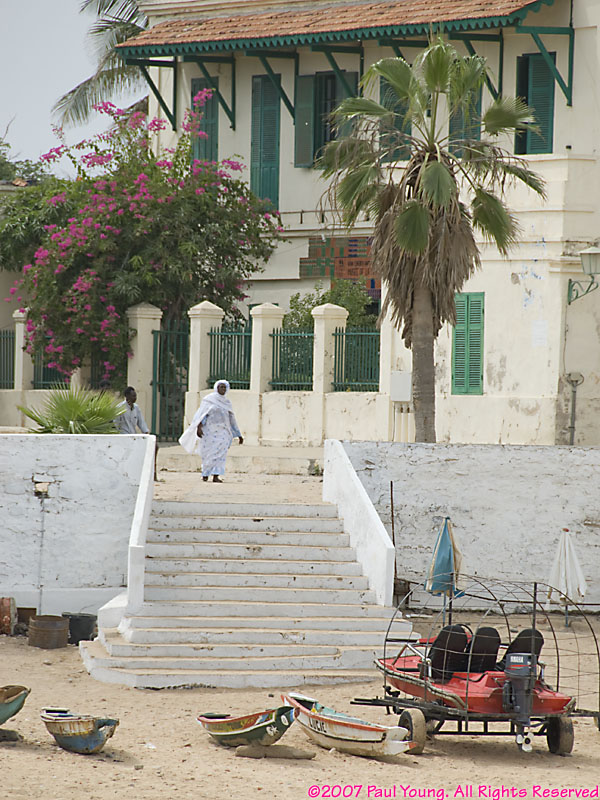 A twenty-minute ferry ride from the dock in Dakar, Gorée Island was first settled by Portuguese merchants in the 15th century. It was the center of the slave trade from this part of West Africa for three hundred years. The symbolically famous "Door of No Return" in the 18th century Maison des Esclaves (Slave House) is a point of pilgrimage for African Americans. The peaceful island has colonial brick buildings from the Portuguese, Dutch, English, and French eras, and hosts an artists' colony.