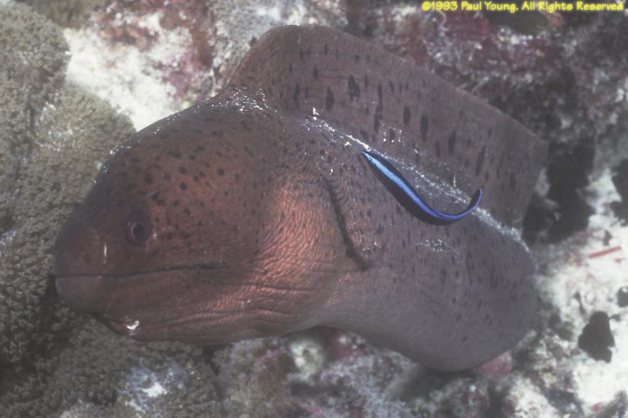Common cleaner wrasse, Labroides dimidiatus, on giant moray, Gymnothorax javanicus
