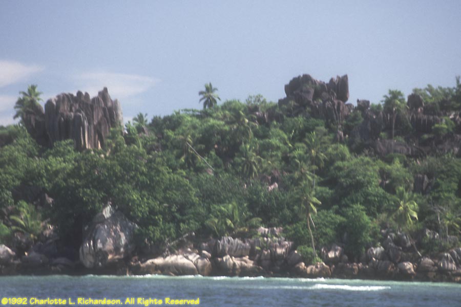 La Digue is the 4th largest island in the Seychelles, about 3 miles long by 2 miles wide. It lies 31 miles from Mahe and three miles east of Praslin. It is the most secluded of the inner islands, having no natural harbor and being surrounded by coral reefs. The highest point is 1092 feet at Nid D'Aigles (Eagle's Nest). The island's pink granite cliffs and huge boulders rise out of white sand beaches with palm forests. It is home to the very rare black Seychelles flycatcher, Terpsiphone corvina, locally called "veuve" ("widow"). La Digue's population of around 2000 makes it the third most populous island in the country. Automobiles are banned. Transportation on La Digue is by ox cart or bicycle.