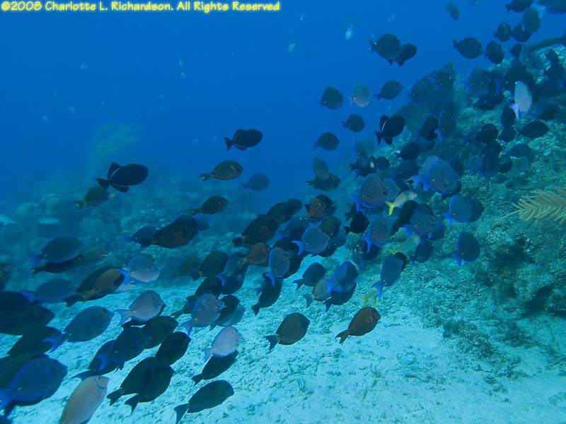 Mixed school of blue tang, Acanthurus coeruleus, and ocean surgeonfish, Acanthurus bahianus