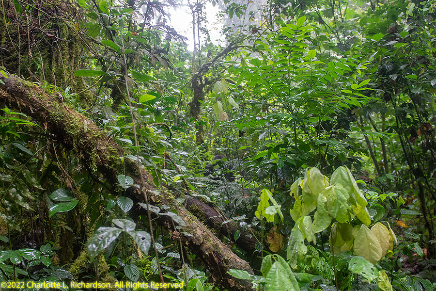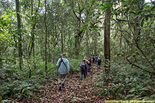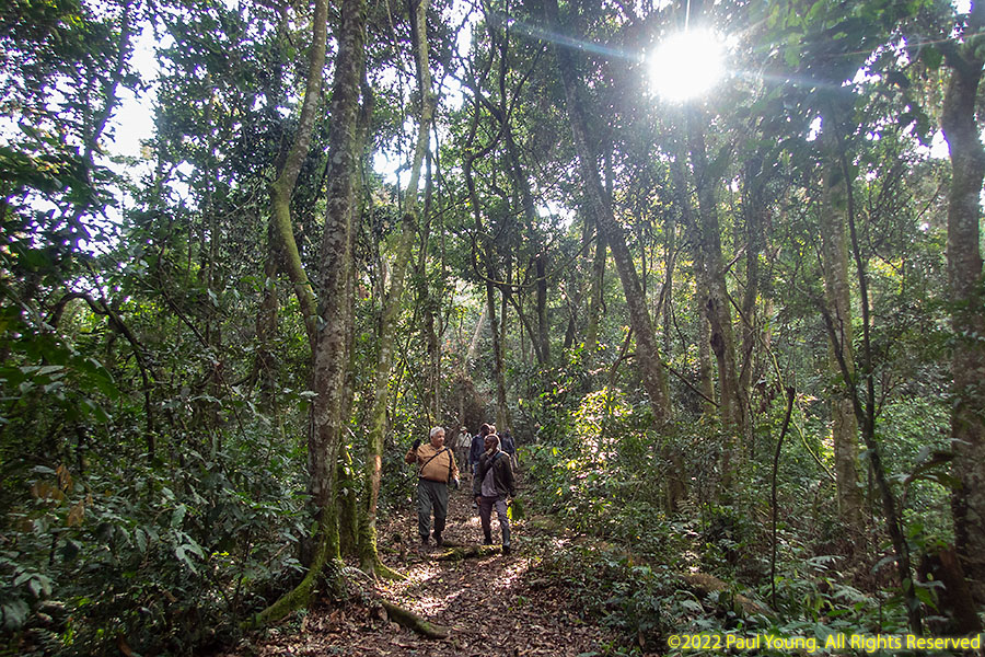 Bwindi Impenetrable National Park in southwest Uganda protects a rugged forested landscape at elevations of 3,904 to 8,553 ft, home to mountain gorillas, 45% of their total population. It lies on the edge of the Albertine Rift. It is a habitat for 120 species of mammals, more than any Ugandan national park other than Queen Elizabeth, ten other primate species besides the mountain gorillas (Gorilla beringei beringei), six antelope species, 350 birds of which 23 are endemic to the Albertine Rift and 14 of which are found only in Bwindi, 220 butterflies including eight endemics, 27 frogs, 160 trees, 100 ferns, and more than a thousand species of flowering plants.
