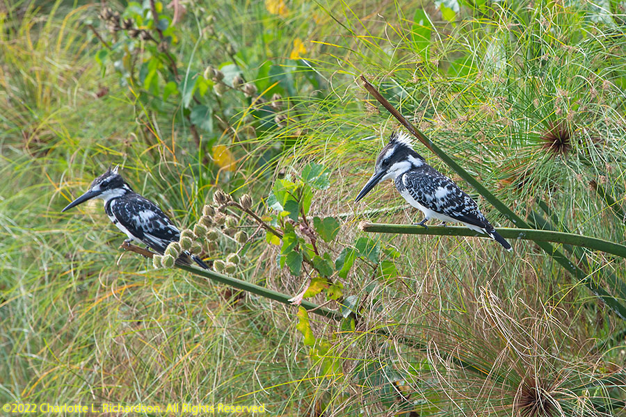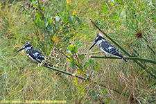 Pied kingfisher, Ceryle rudis, in flight, perching male (left) and female (right)