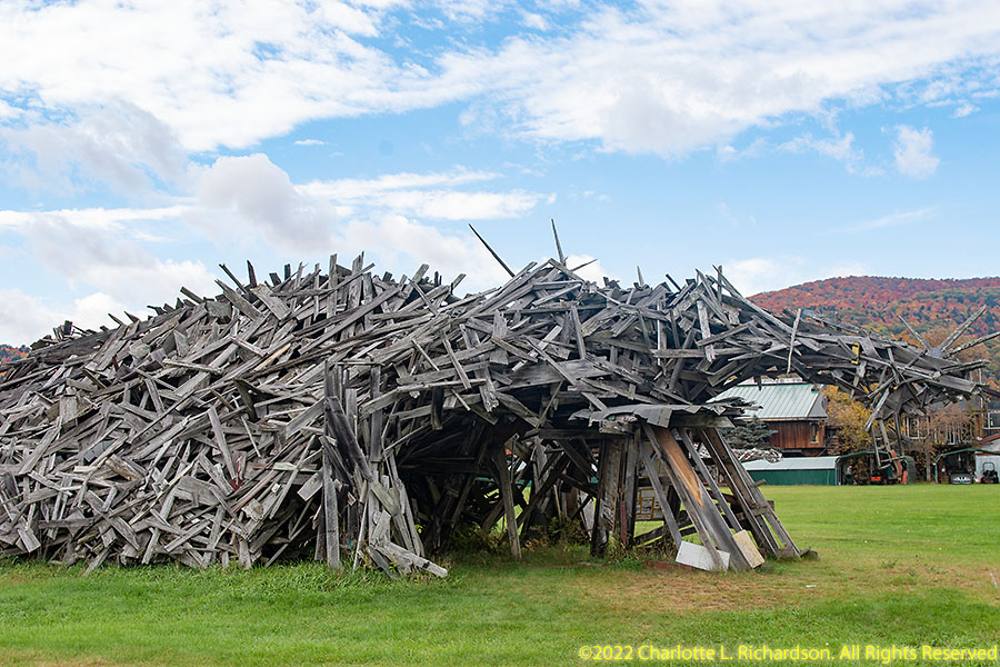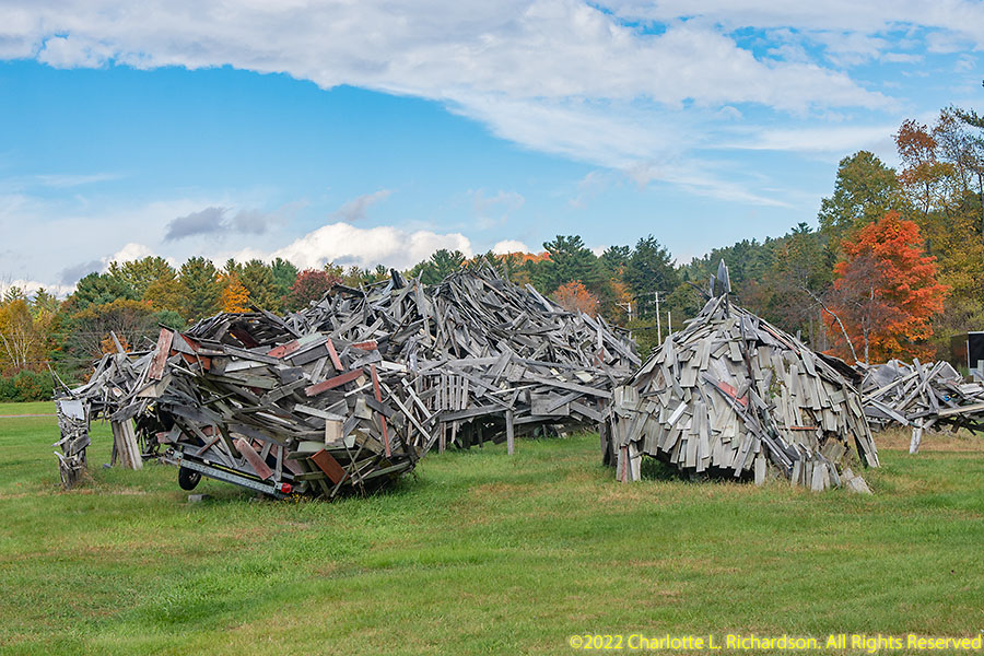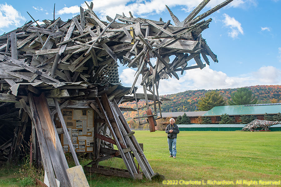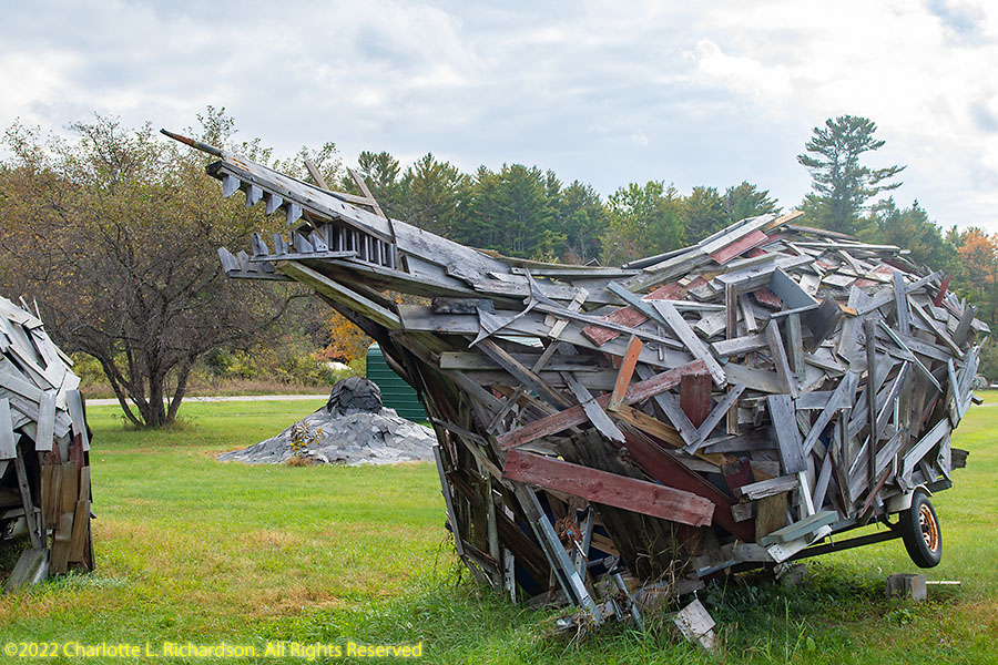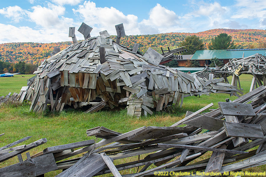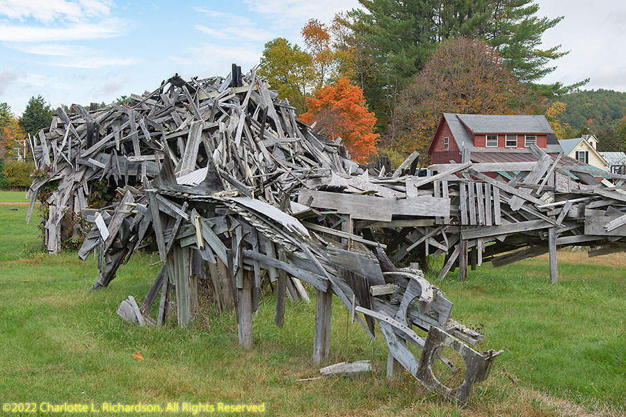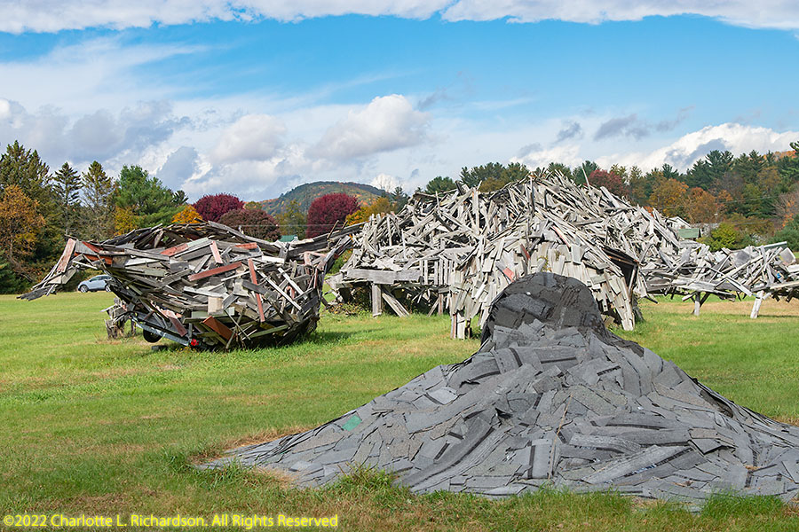 Scrap wood sculptures of fanciful dinosaur-like figures at this quiet grass landing strip, which is home to a soaring club. The Vermontosaurus was the creation of Brian Boland, owner of the Post Mills Airport (2B9), using scrap lumber from a collapsed portion of his private museum and hot-air balloon manufacturing facility. Boland died in a balloon accident on July 15, 2021.