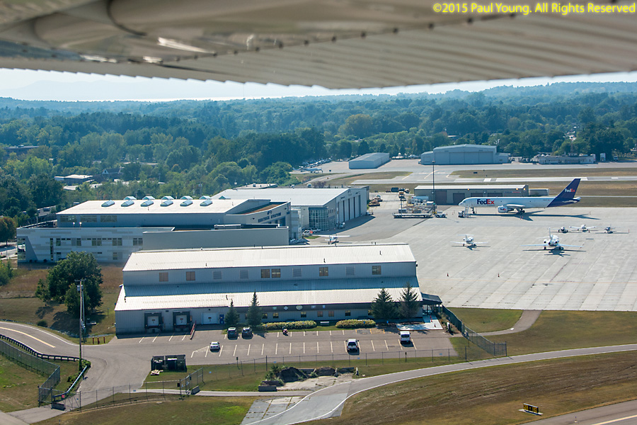 Return flight after climbing Mt. Mansfield Monday morning, taxiing past the commercial ramp and then flying over the air cargo ramp on an IFR clearance over the Green Mountains to home. A very smoky brush fire just west of Manchester, New Hampshire, smelled like smoke for fifty miles. Late-afternoon return home to 6B6.