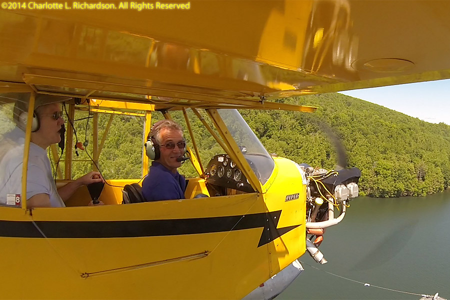 My birthday present: flying a Cub on straight floats, on the Housatonic River. This Cub has a battery-powered intercom, no radios, no flaps, and no electical system. It is hand-propped. I found that I did not miss having flaps.