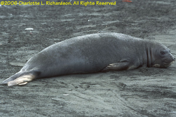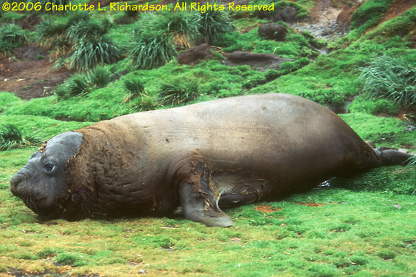 The elephant seal is the largest of all pinnipeds. Full-grown males can be more than 4 meters long. Sleepy and awkward on land, they look funny when molting, which they do in February. When not breeding or molting, they live in the open sea.