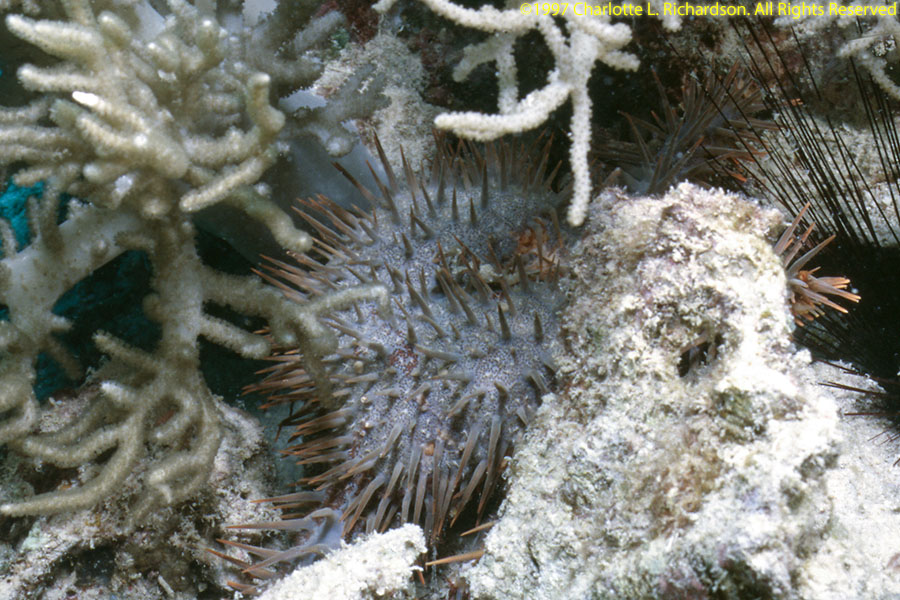 Sea unrchins are spiny globular echinoderms. Like all echinoderms (including sea stars) the adult animals have five-fold symmetry.