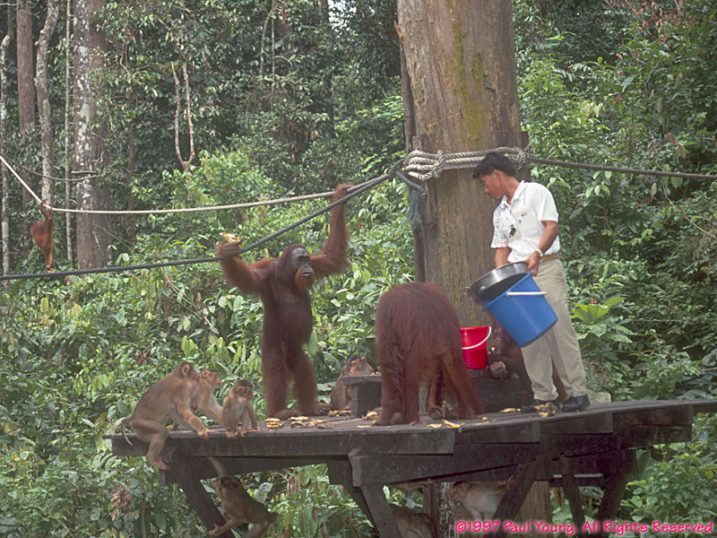 Sepilok Orangutan Sanctuary houses former pets and orphaned infant Bornean orangutans, Pongo pygmaeus, being returned to the wild.