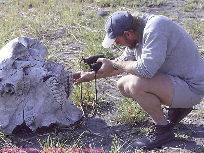 You can approach wildlife on foot on Chief's Island in the Okavango Delta. Peter, our guide, examines an elephant skull to determine how the animal died. This elephant was killed by lions, not by starvation due to worn-out teeth.