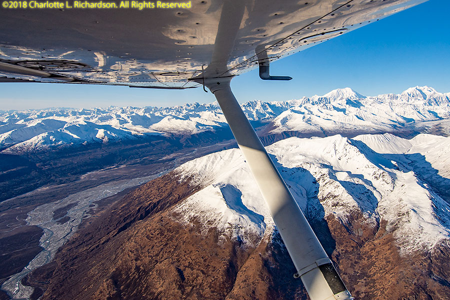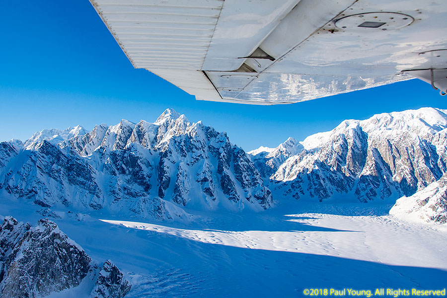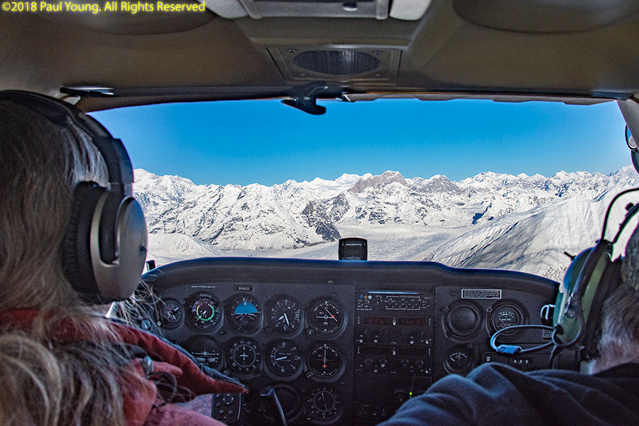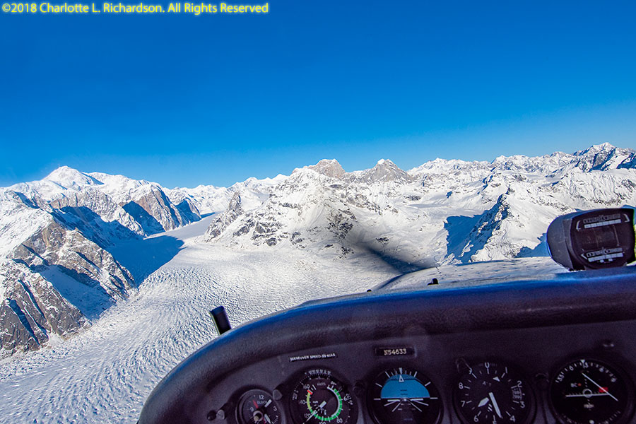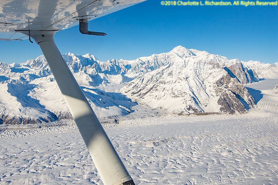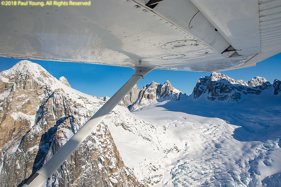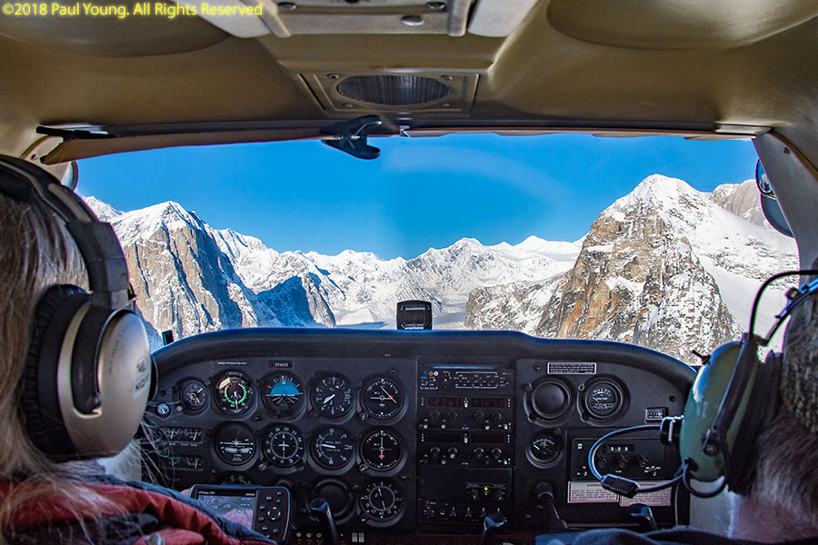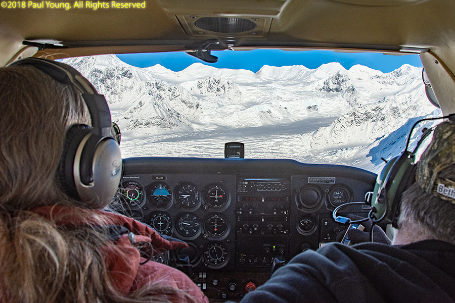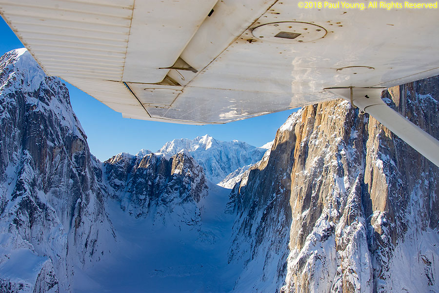Flying the Ruth Glacier Great Gorge on Denali. I rented a Cessna 172 from Legends Aviation in Willow, and flew once again with Walt Warner. Our route took us over the foothills of the Alaska Range at 6500'. We intercepted the outflow of the Ruth Glacier and flew up into Denali, up the Great Gorge. Only two other aircraft were on the route. Another fixed-wing aircraft was behind me, and a red helicopter started up the gorge as I was coming out. Visibility was unlimited.